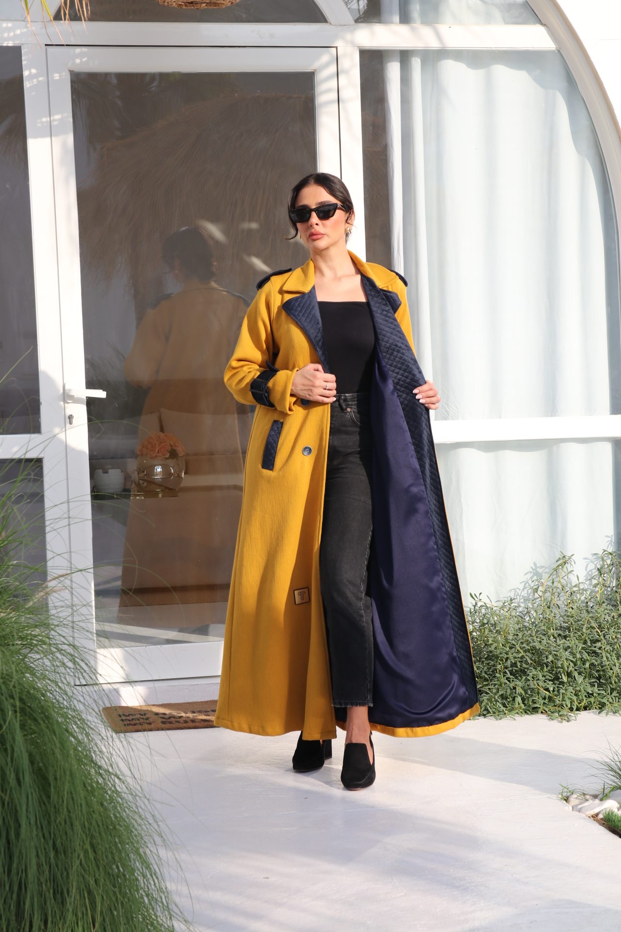 ترانشكوت بلون أصفر مصنوع من خامة بولو ، مزين بمخمل ديباج كحلي على أطراف الأكمام والقبة، يضيف لمسة فخمة وتباين أنيق للتصميم. قطعة مميزة مثالية للإطلالات اللافتة والعصرية