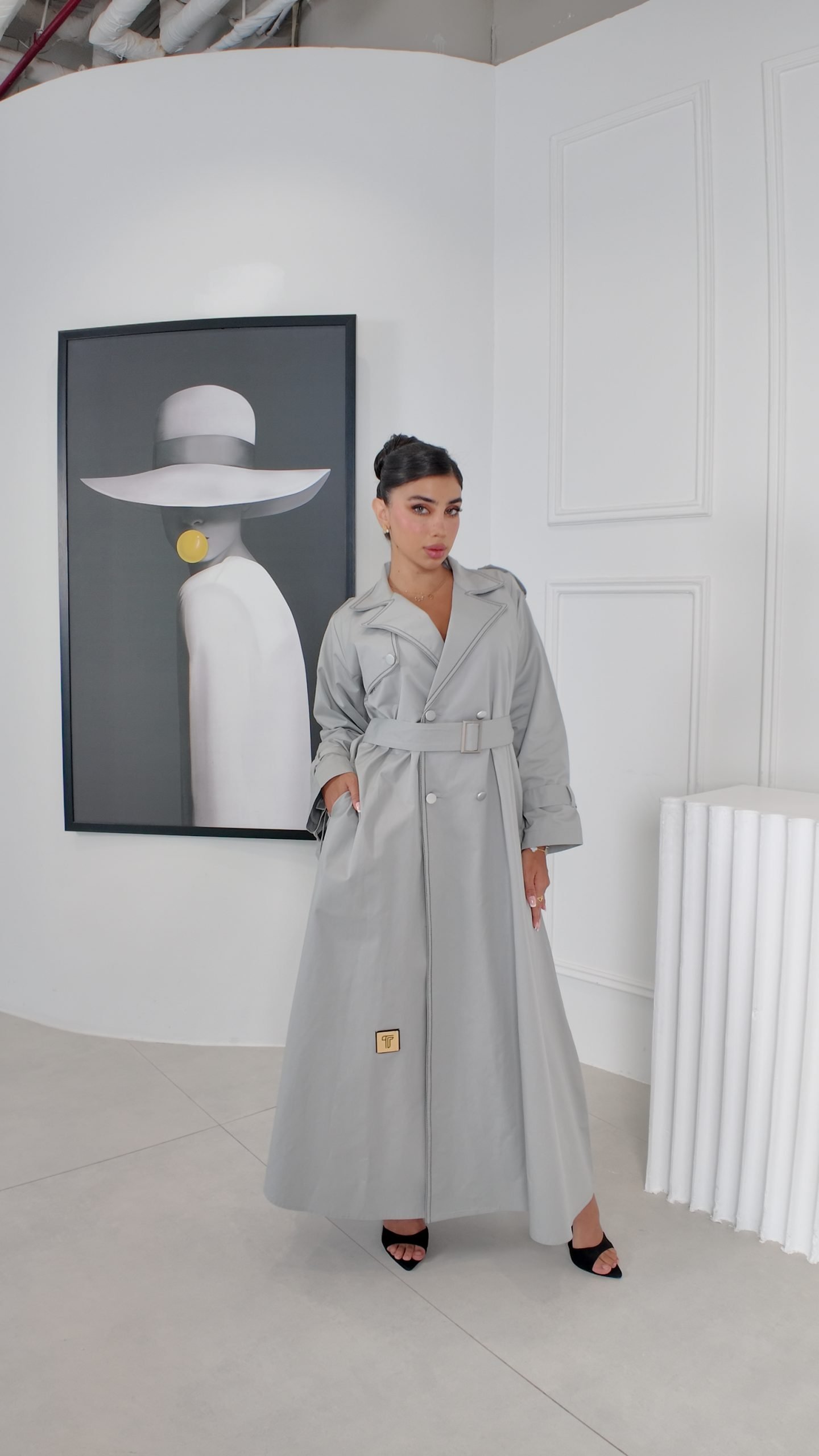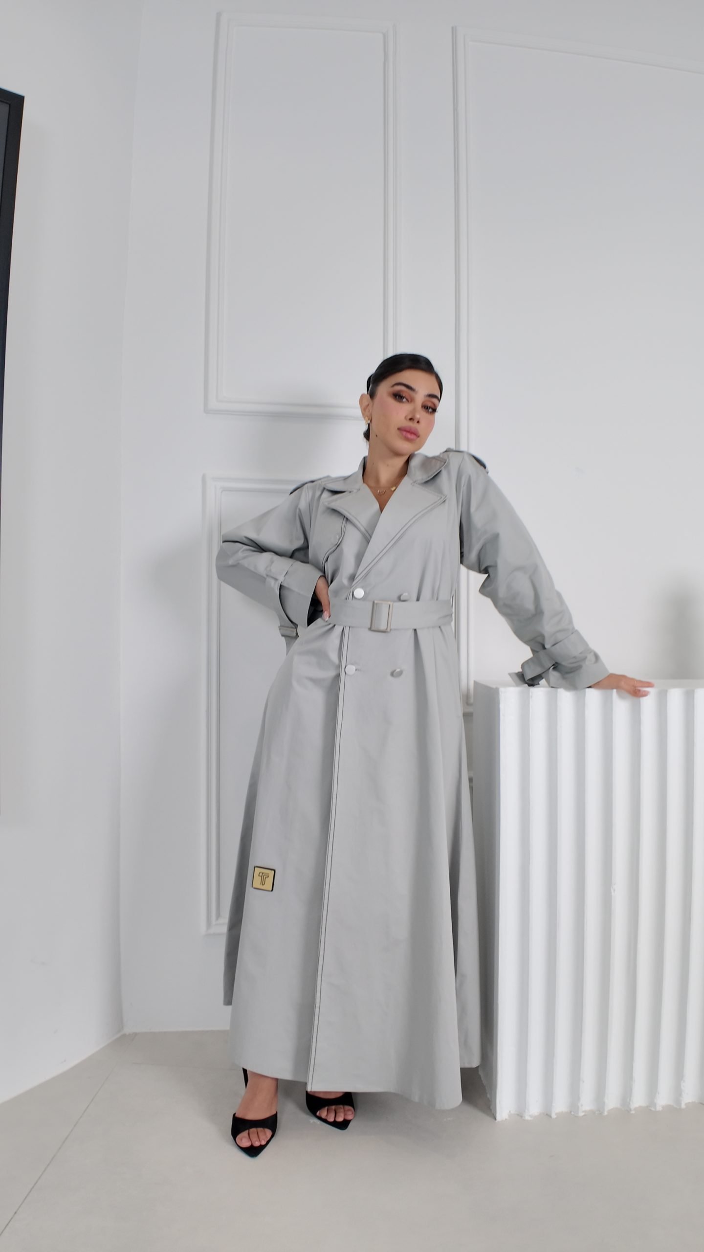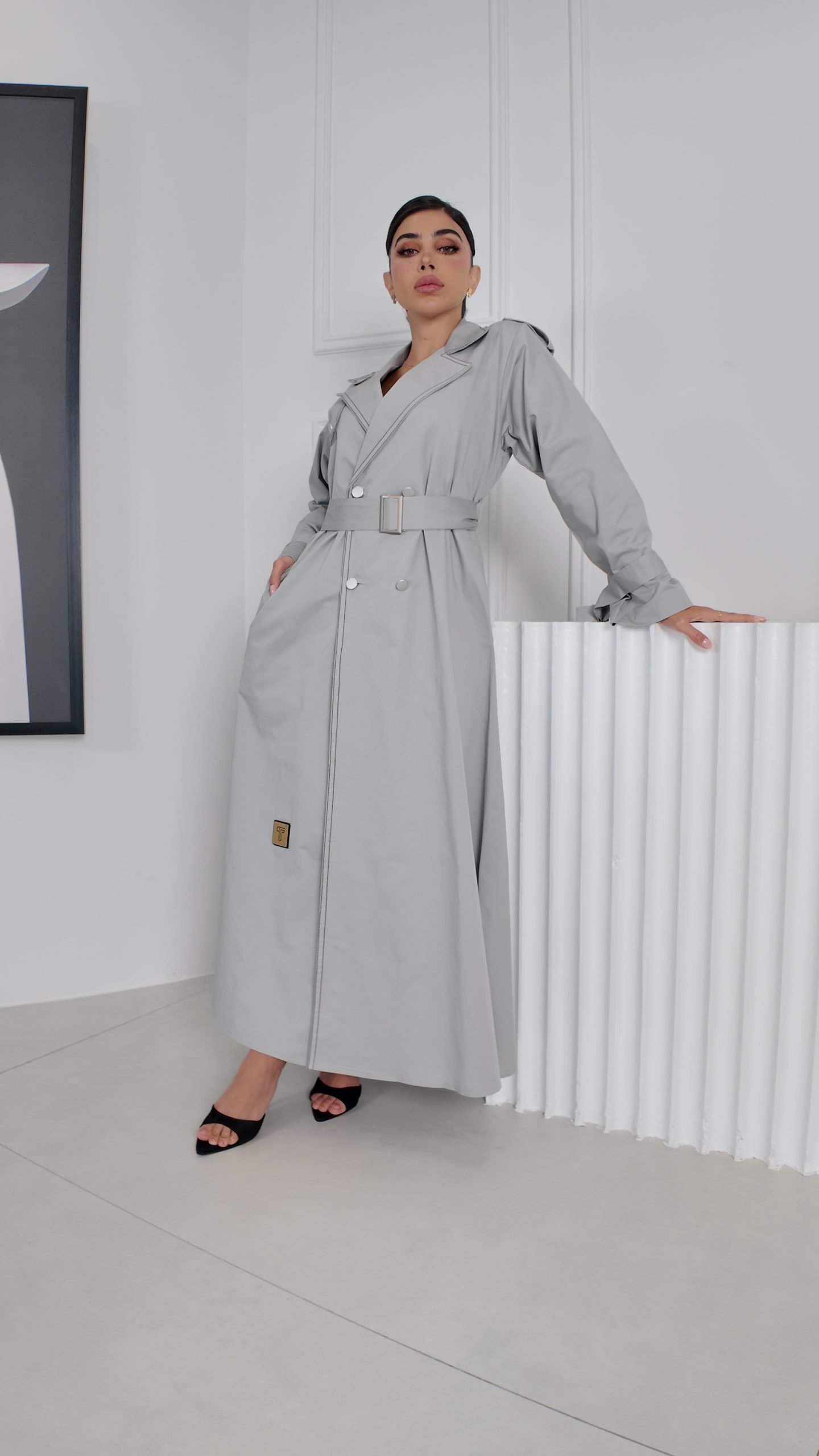 ترانشكوت بلون رمادي فاتح مصنوع من خامة مكس مارا الفاخرة، مزود بحزام يحدد الخصر ويضيف لمسة أنثوية ناعمة. تصميم أنيق وعملي