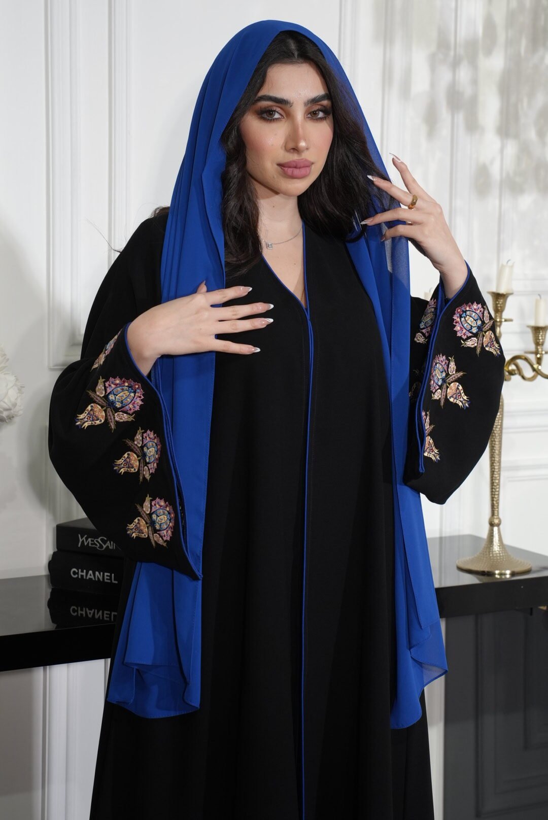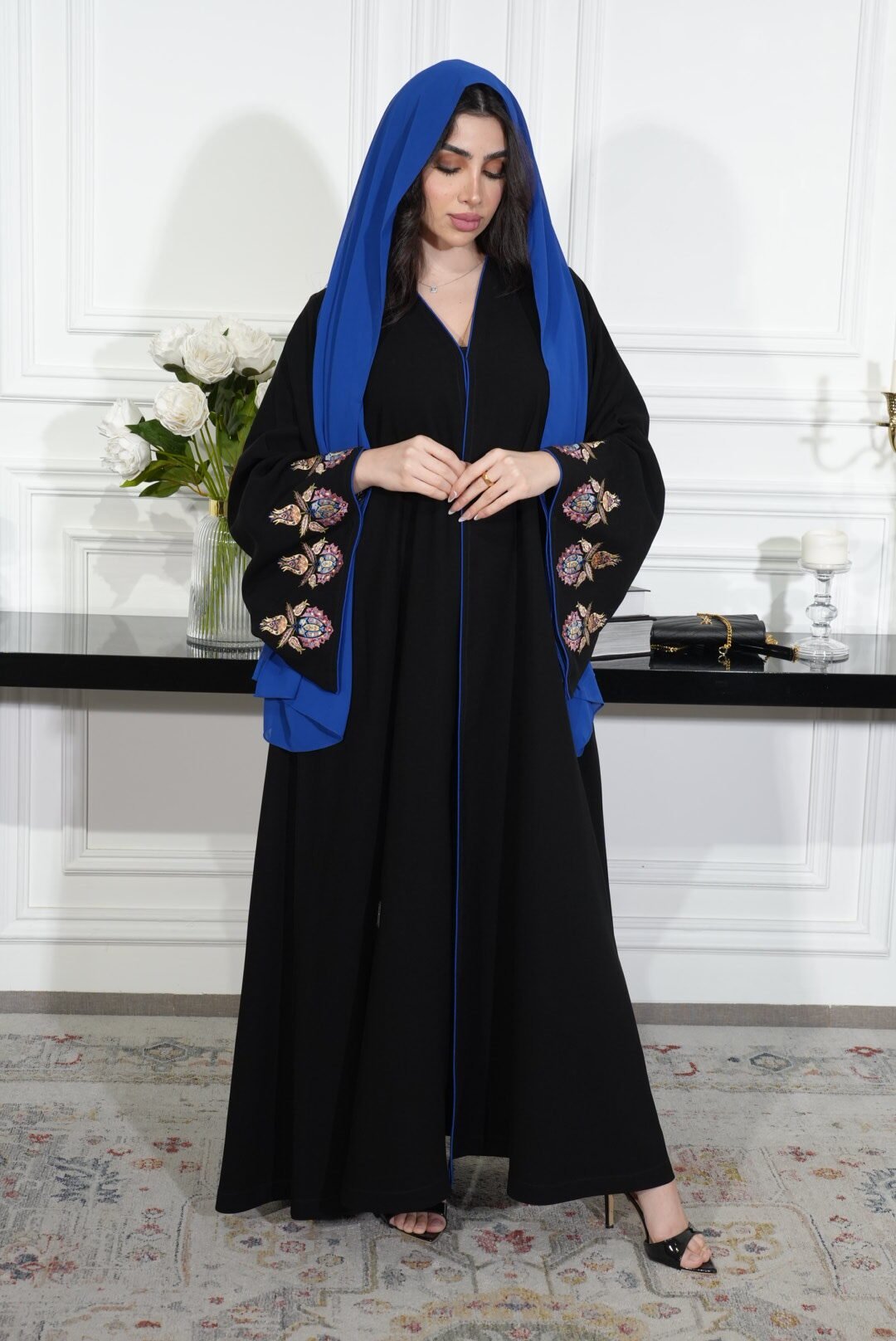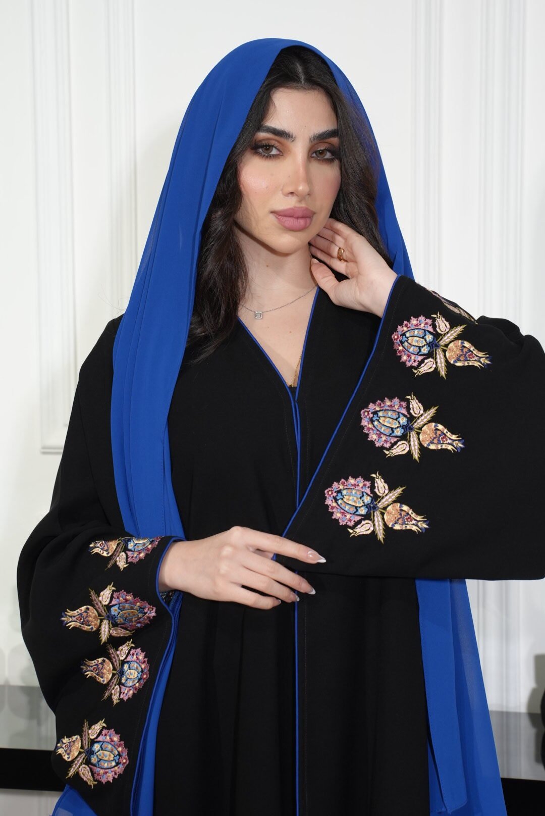 عباية سوداء أنيقة مصنوعة من خامة كوبا كوري الناعمة، تتميز بتطريز مميز بلون أزرق ممزوج بألوان الصيف الزاهية على طرف الكم. تصميمها العصري يجمع بين الراحة والأناقة، مما يجعلها خيارًا مثاليًا للإطلالات اليومية والمناسبات الخاصة.