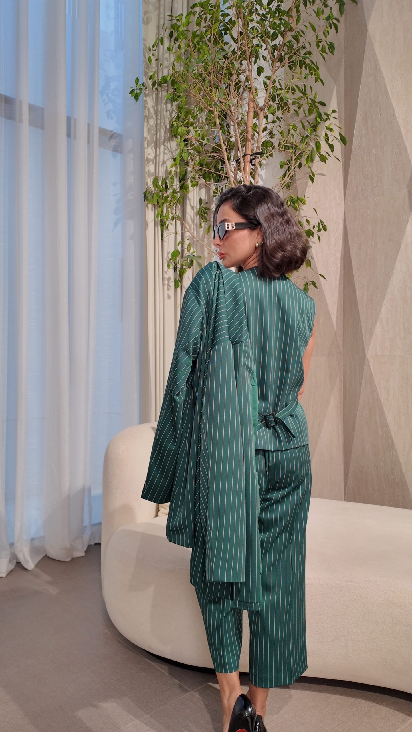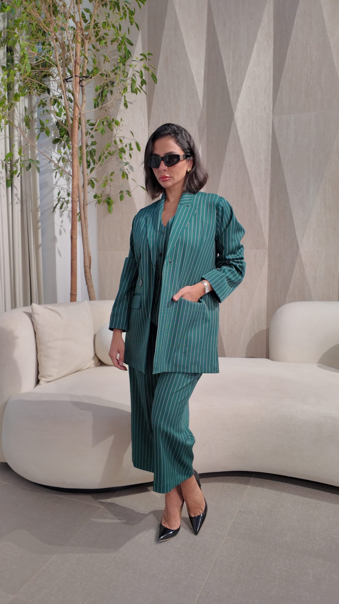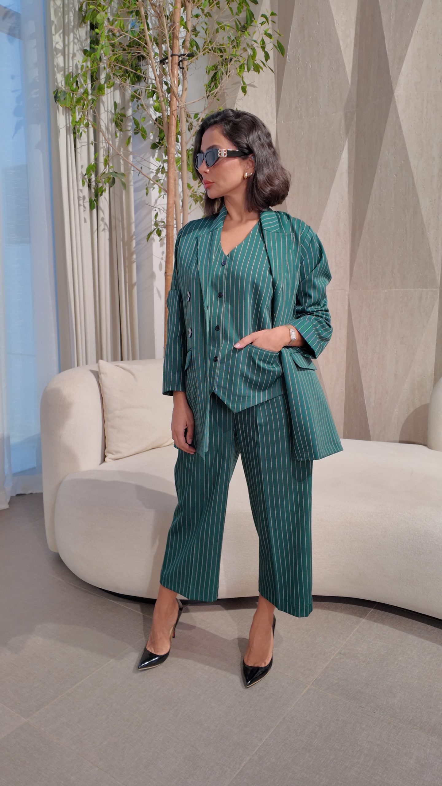 بدلة مكونة من 3 قطع مصنوعة من خامة كريب مريحة وراقية بلون أخضر مقلم يضيف لمسة عصرية ناعمة. تتكوّن من بنطلون بقصة أنيقة، فيست كلاسيكي، وبليزر بتفاصيل ناعمة تكمل اللوك بأسلوب متناسق.