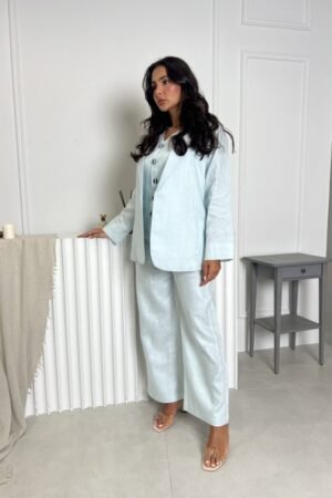 بدلة مكونة من 3 قطع مصنوعة من لينن طبيعي 100٪ بلون أزرق سماوي ناعم، تضم بنطلون بقصة ناعمة، فيست كلاسيكي، وبليزر مصمم بتفاصيل راقية.