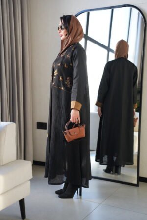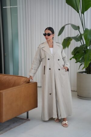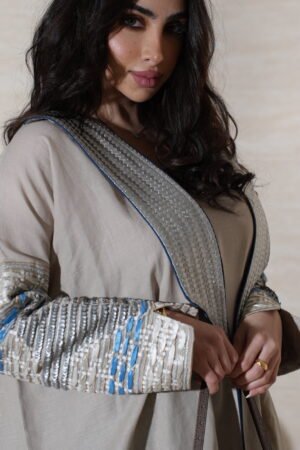 بشت مصنوع من لينن طبيعي 100٪ بلون رمادي ناعم. مزينة بتطريز أيكات هندي تقليدي مع لمسات ترتر لامعة على الأكمام، كلها شغل يدوي متقن يعكس الذوق الرفيع والحرفية العالية. تصميم مثالي للإطلالات الأنيقة والمناسبات المميزة