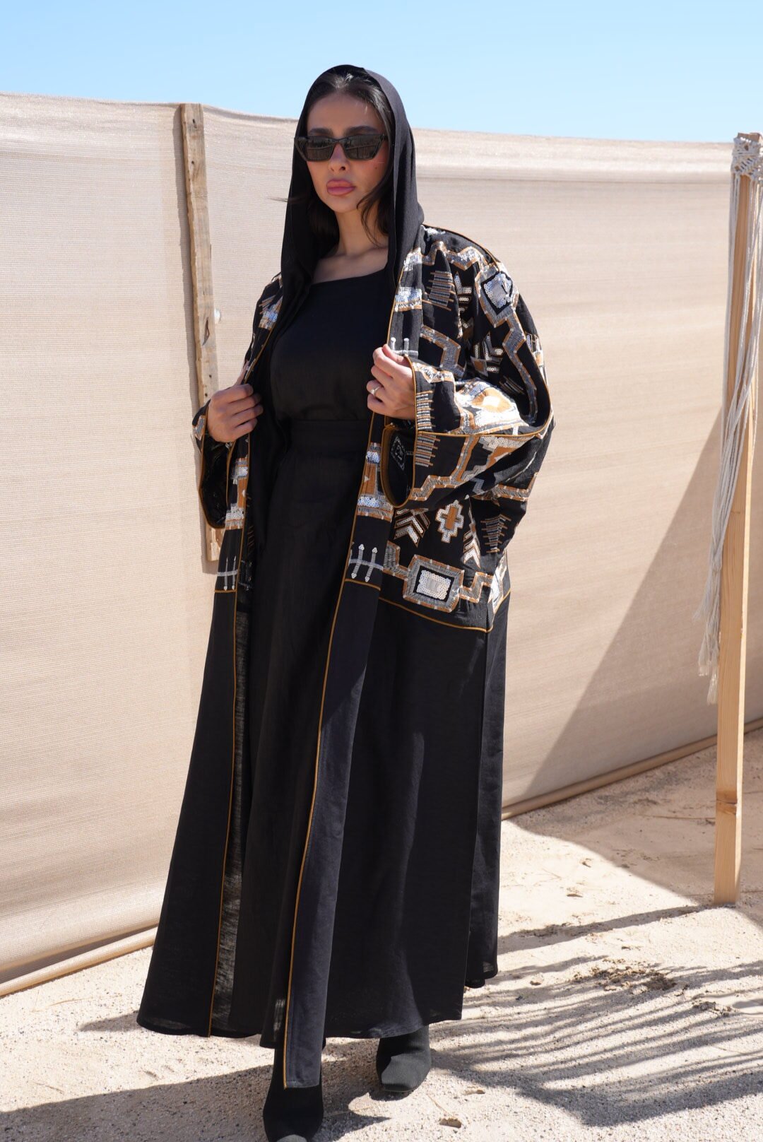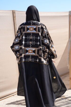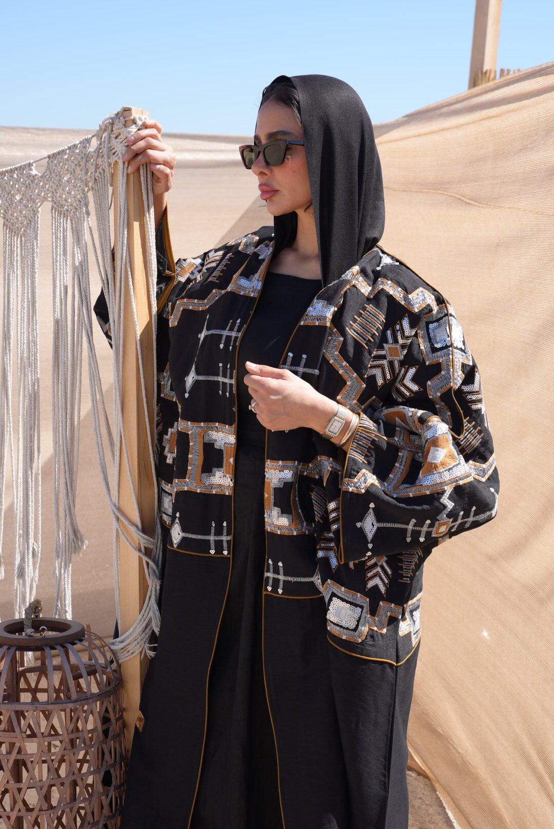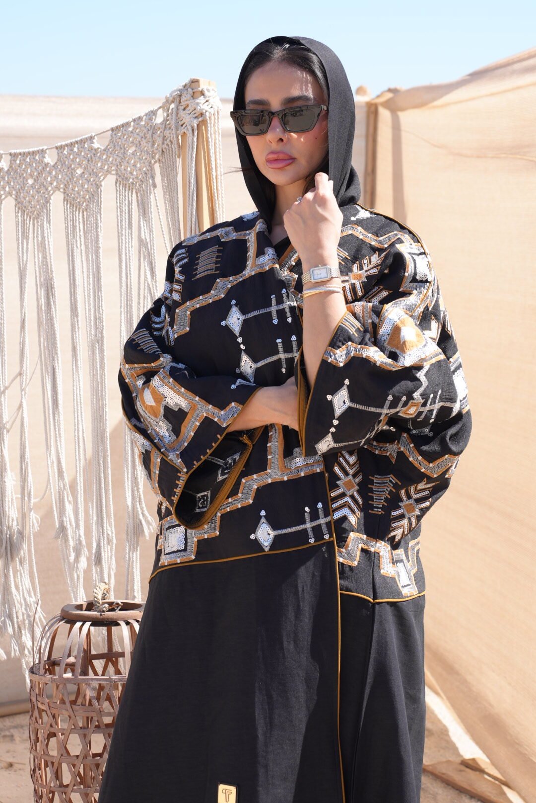 بشت فاخر مطرّز يدوياً بلمسات ترتر لامعة تضيف لمسة فخامة وأناقة. الجزء السفلي مصمم من لينن طبيعي 100٪ باللون الأسود، مما يمنح البشت توازن مثالي بين النعومة والفخامة. مناسب للمناسبات المميزة والإطلالات الراقية