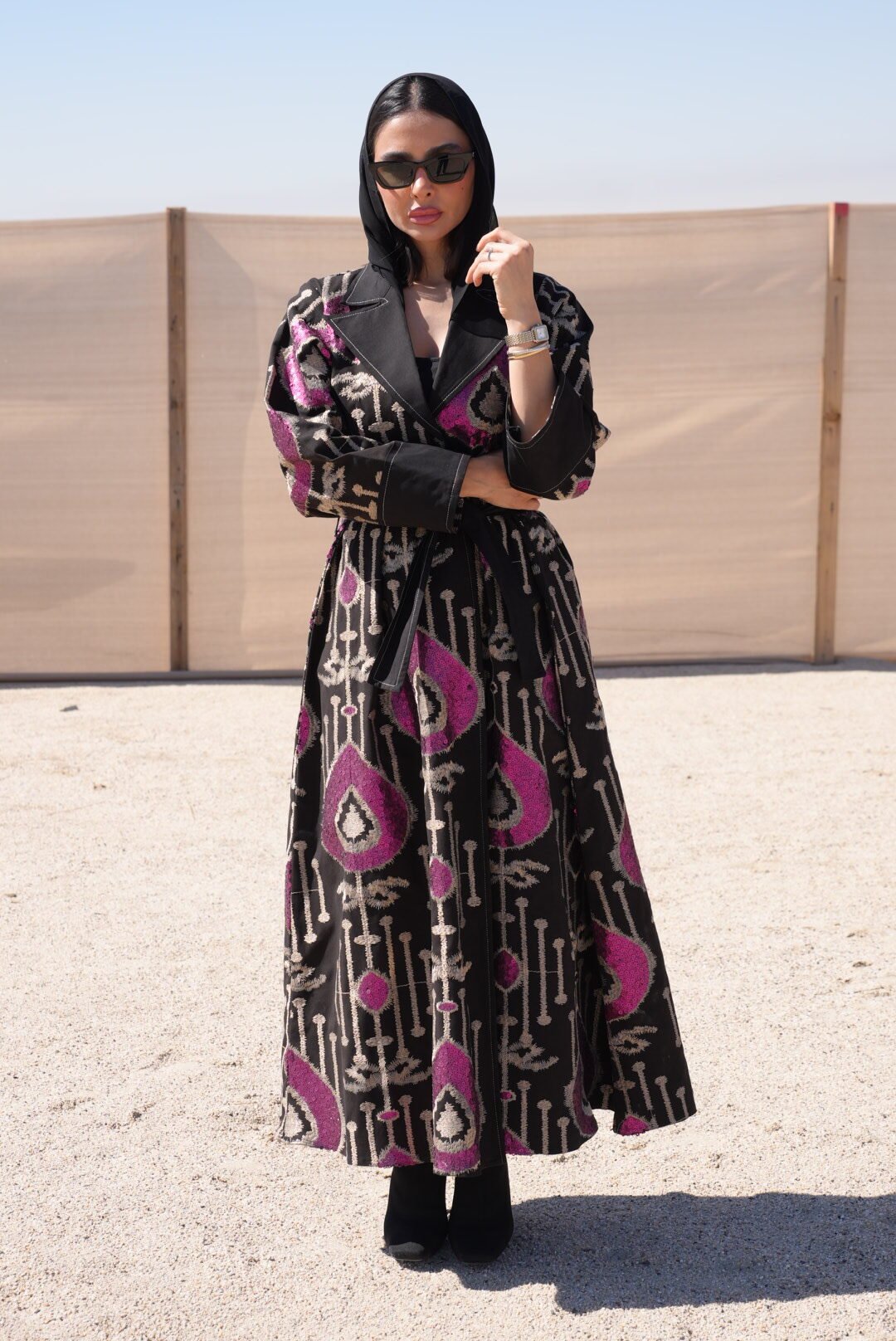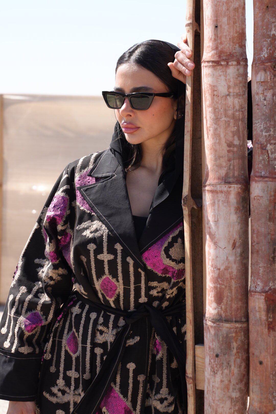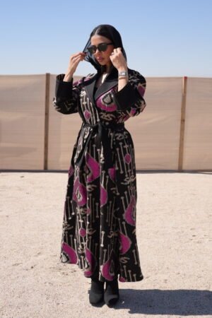 بليزر فاخر مصنوع من قماش قطن جينز أسود بتطريز بيج أنيق وتفاصيل ترتر وردي تضيف لمسة أنثوية ناعمة وراقية. يأتي مع حزام يحدد الخصر ويمنح التصميم طابع أنثوي جذاب. قطعة مثالية للمناسبات الخاصة والإطلالات المميزة اللي تجمع بين الجرأة والأناقة
