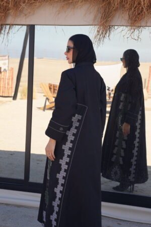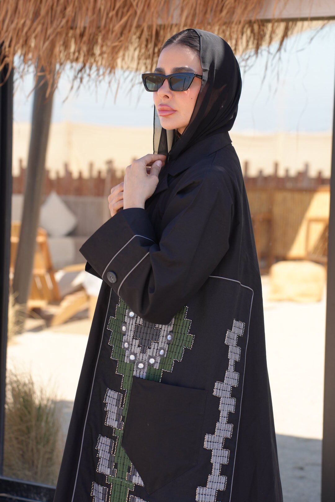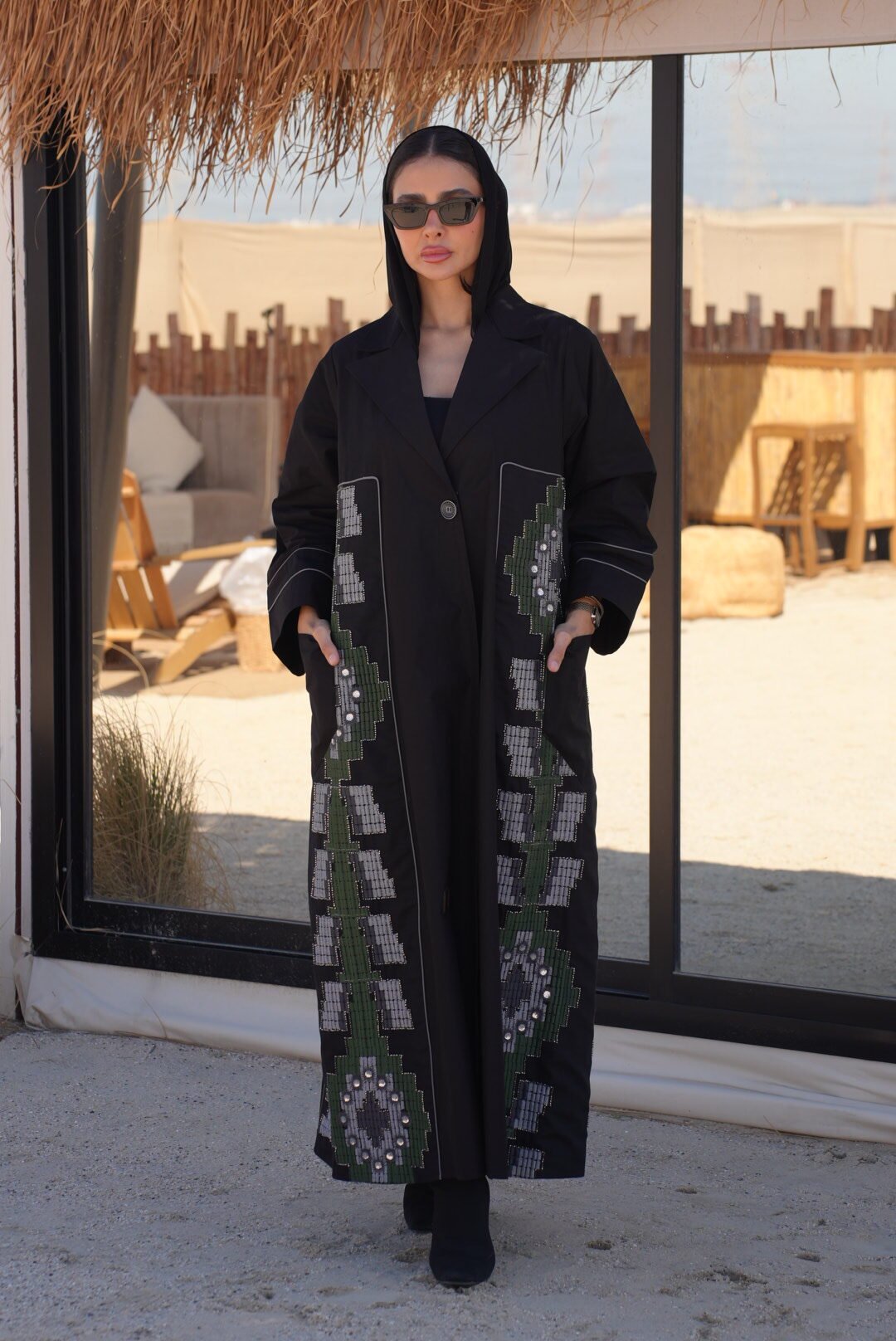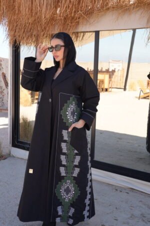 بليزر أسود مصنوع من قطن مكس مارا بجودة عالية، يتميز بتطريز وشك يدوي بلون زيتي ودرجات رمادي تضيف عمق وأناقة للتصميم. قطعة تجمع بين الكلاسيكية واللمسات العصرية، مثالية للإطلالات الرسمية والمناسبات اللي تحتاج حضور راقٍ ومميز