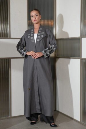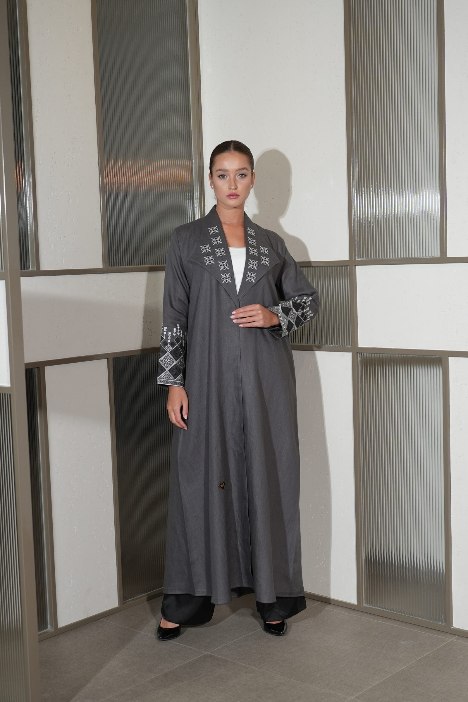بليزر رمادي أنيق مصنوع من لينن طبيعي 100%، يتميز بخامة عالية الجودة تمنحك الراحة. يتميز بالتطريز اليدوي الدقيق على الأكمام والياقة بتفاصيل فنية تضيف لمسة فريدة من الأناقة، ليكون خيارك الأمثل للإطلالات الرسمية.