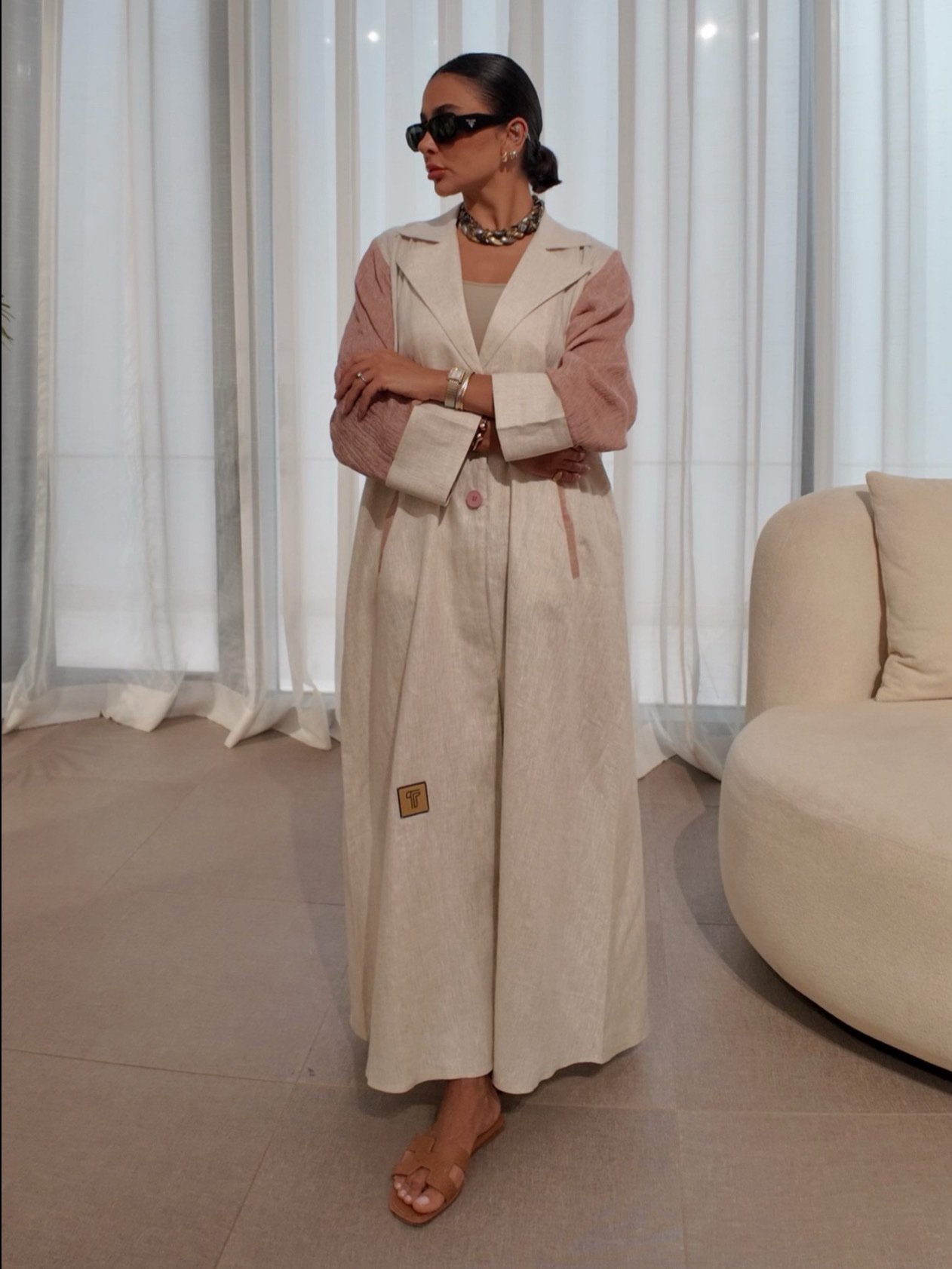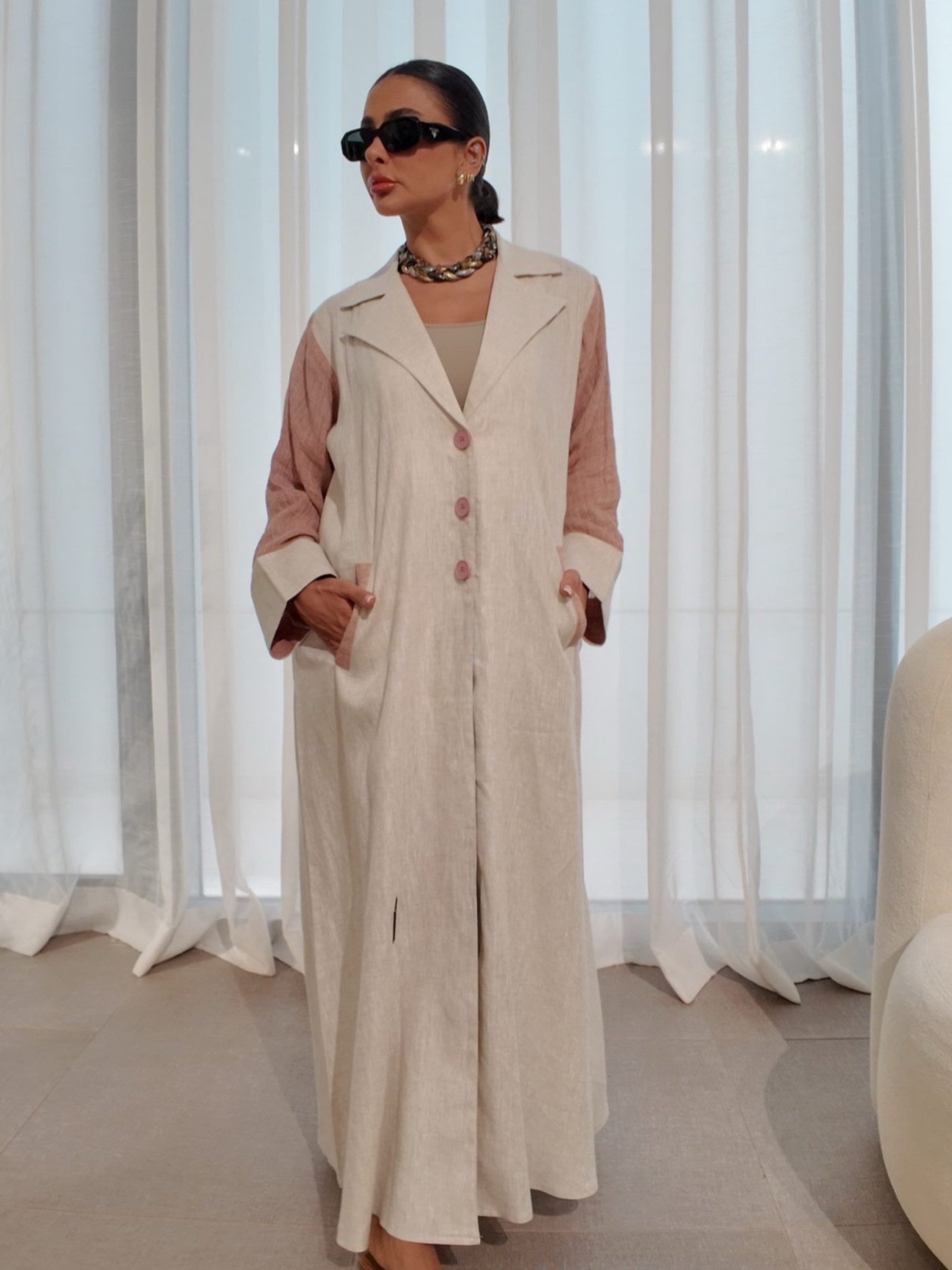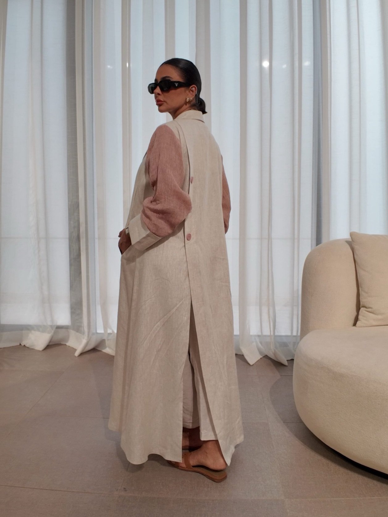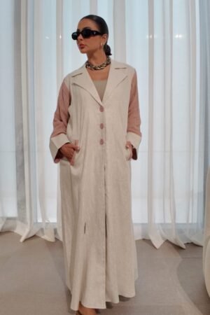 بليزر بيج من لينن طبيعي 100٪، يتميز بأكمام وردية من لينن معفّس وتفاصيل أزرار خلفية تضيف لمسة عصرية. تصميم أنيق وناعم، مثالي للإطلالات المميزة بأسلوب أنثوي وراقي