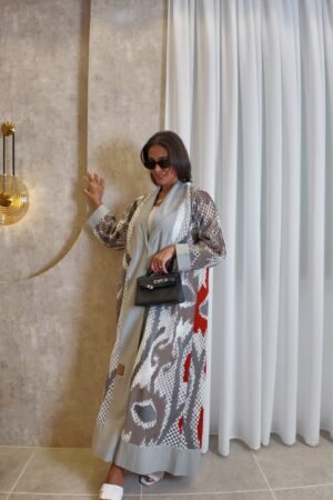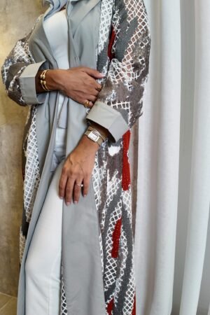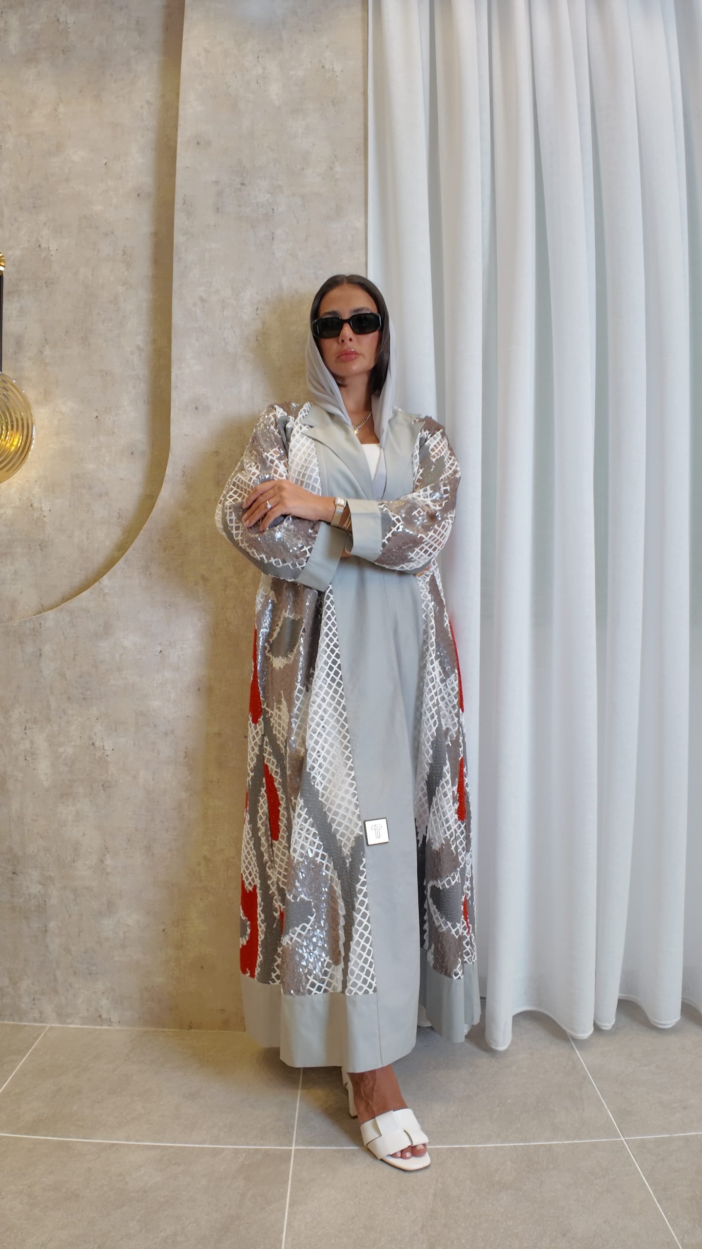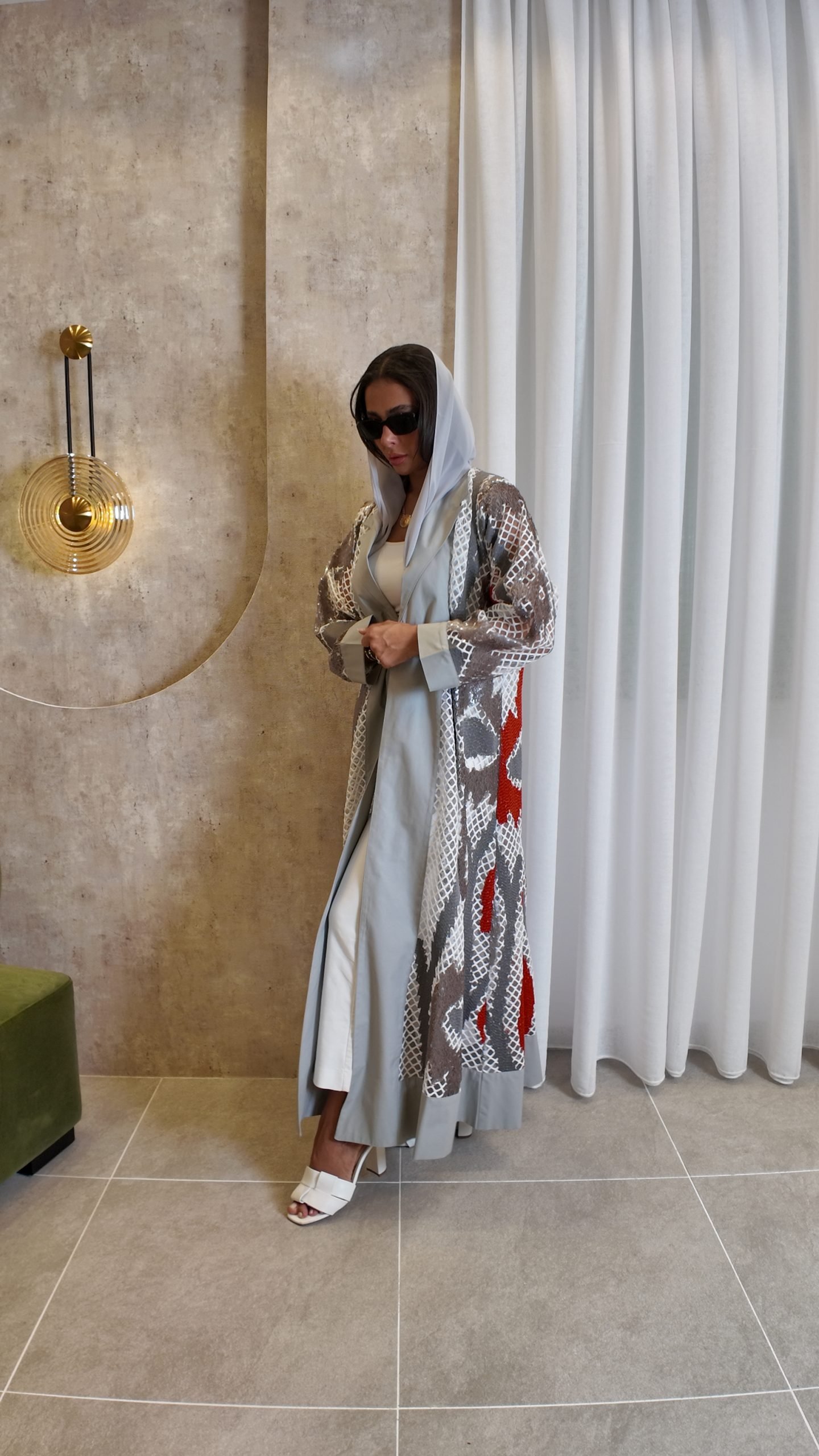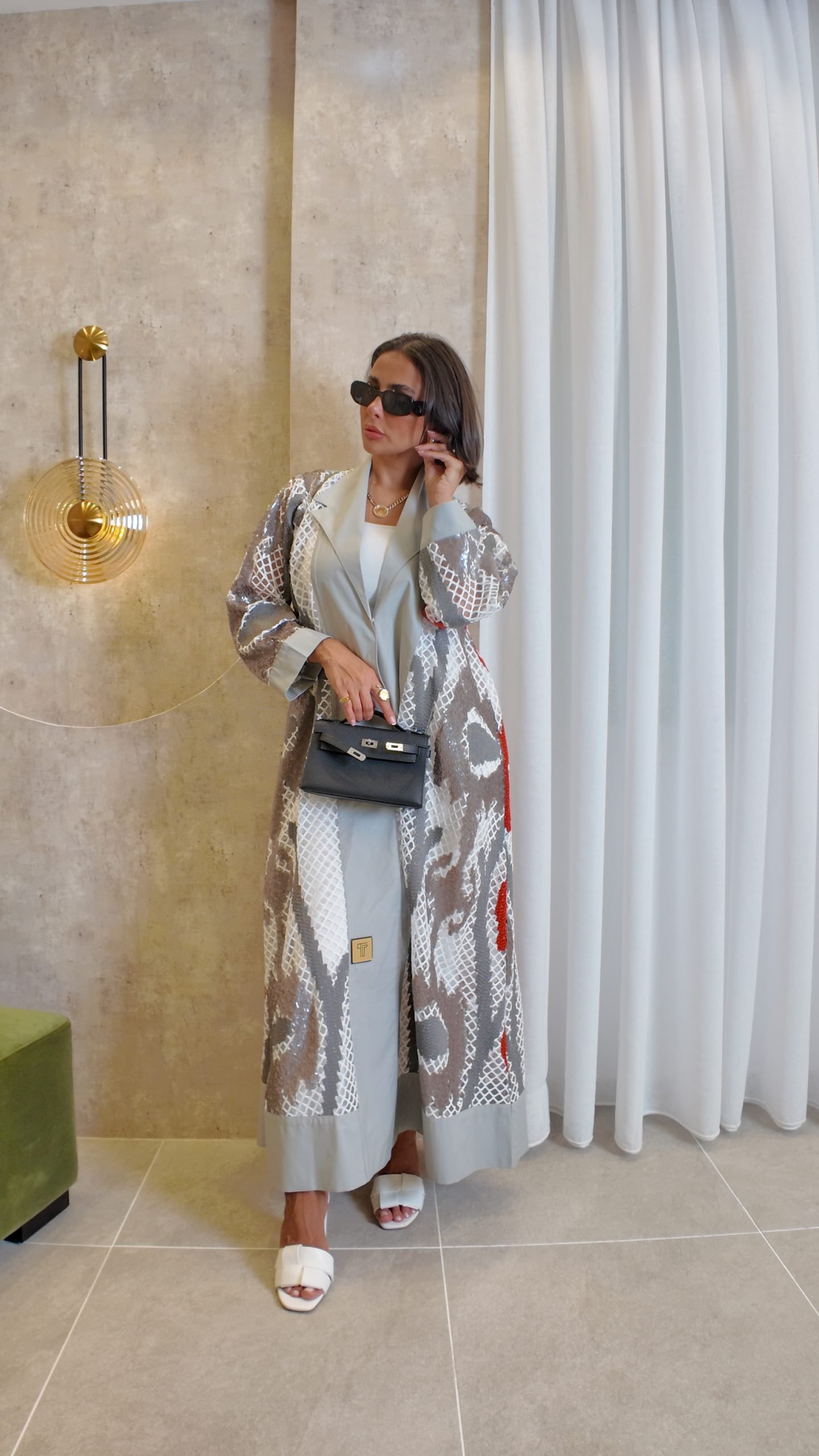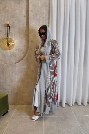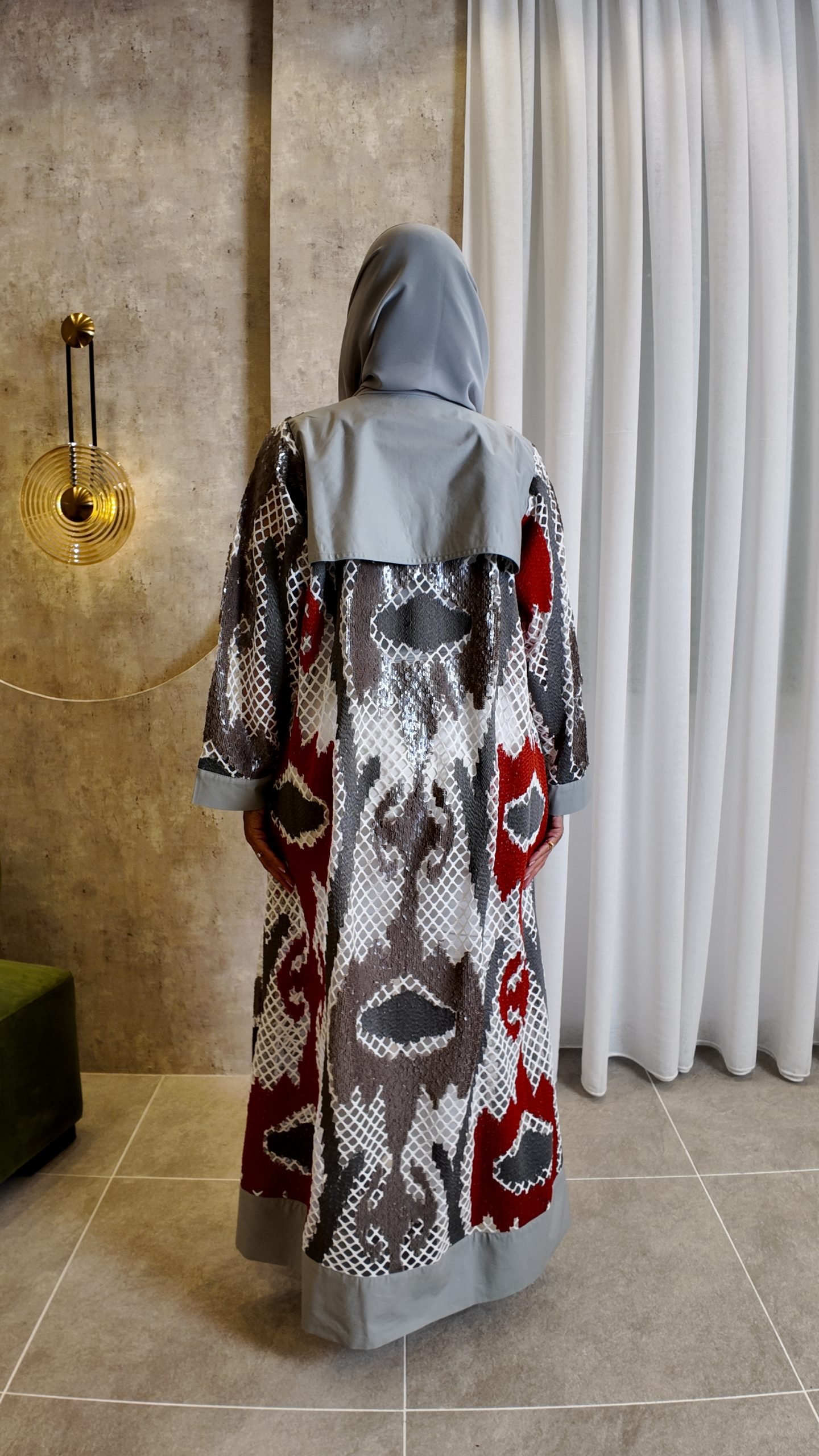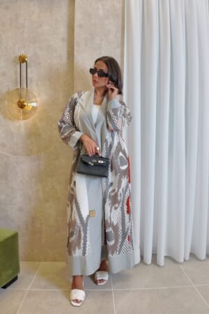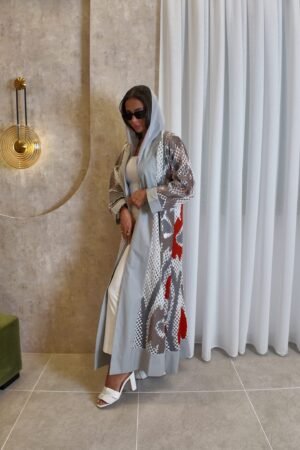 بليزر بلون رمادي فاتح بتطريز مستوحى من القصّة الأوزبكية، مزين بترتر ناعم بدرجات الرمادي الغامق والفاتح مع لمسات من الأحمر، يضفي لمسة فنية راقية وجريئة. تصميم أنثوي وأنيق مثالي لإطلالة مميزة