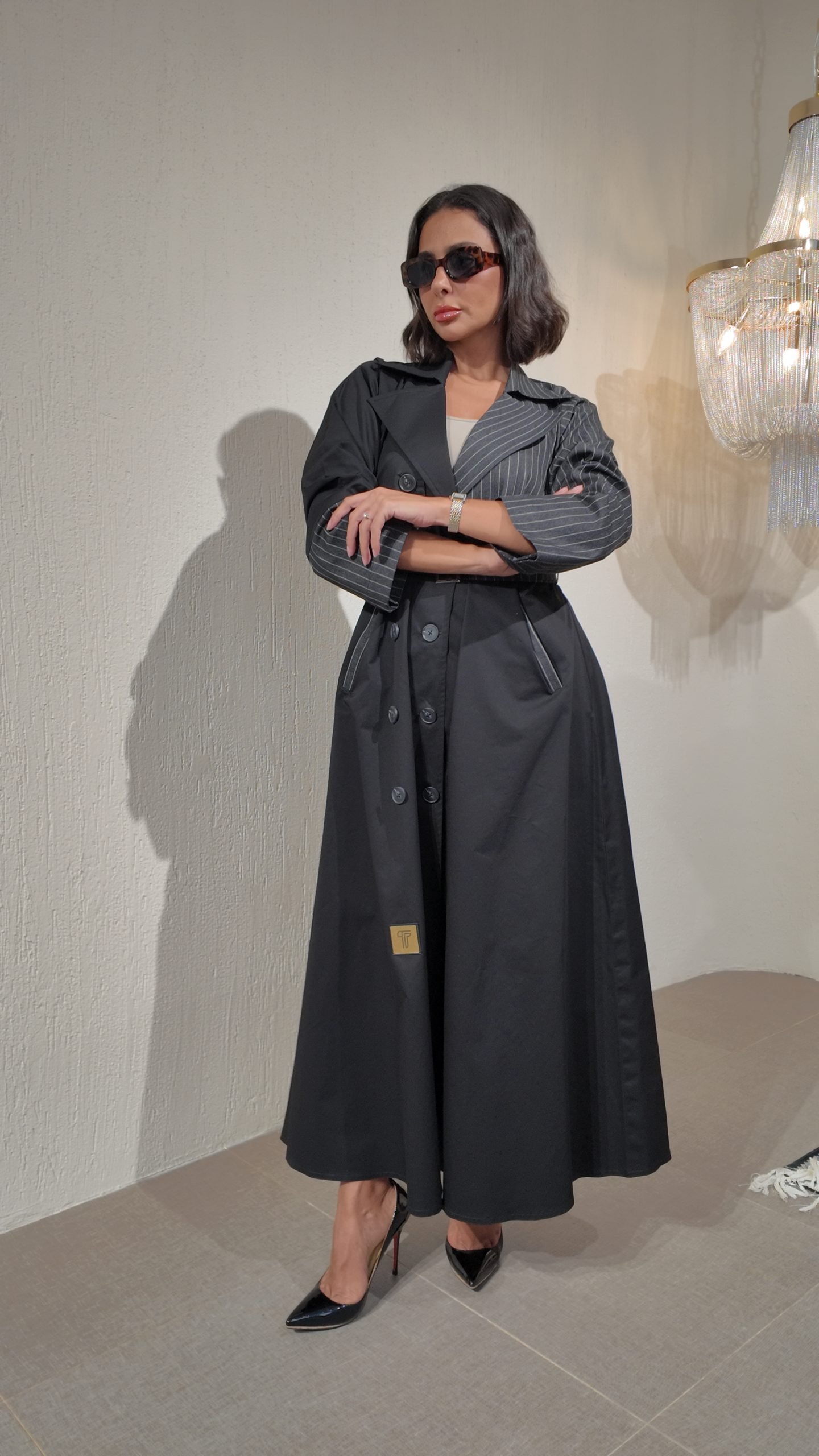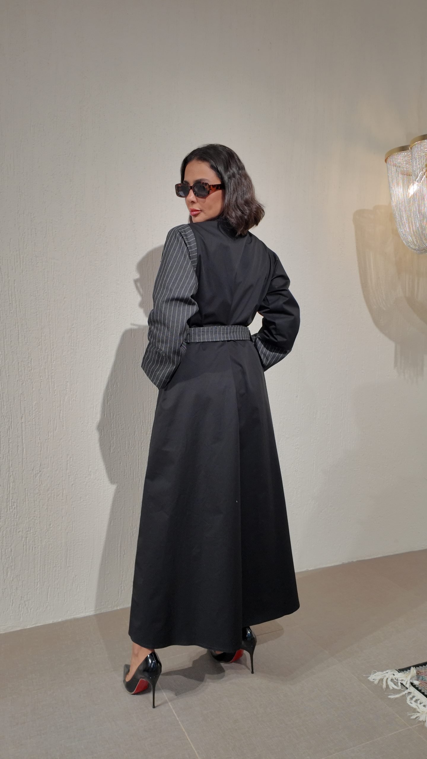 بليزر أسود مصنوع من قطن مكس مارا، مزين بتفاصيل من قماش جينز مقلم. يأتي مع حزام على الخصر يبرز القوام ويمنح التصميم طابع أنثوي. قطعة مميزة مثالية للإطلالات اليومية