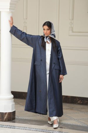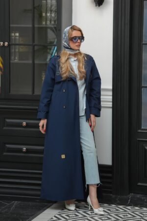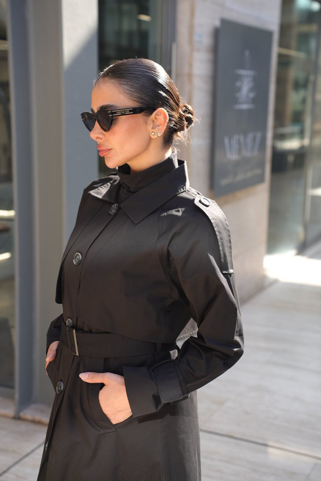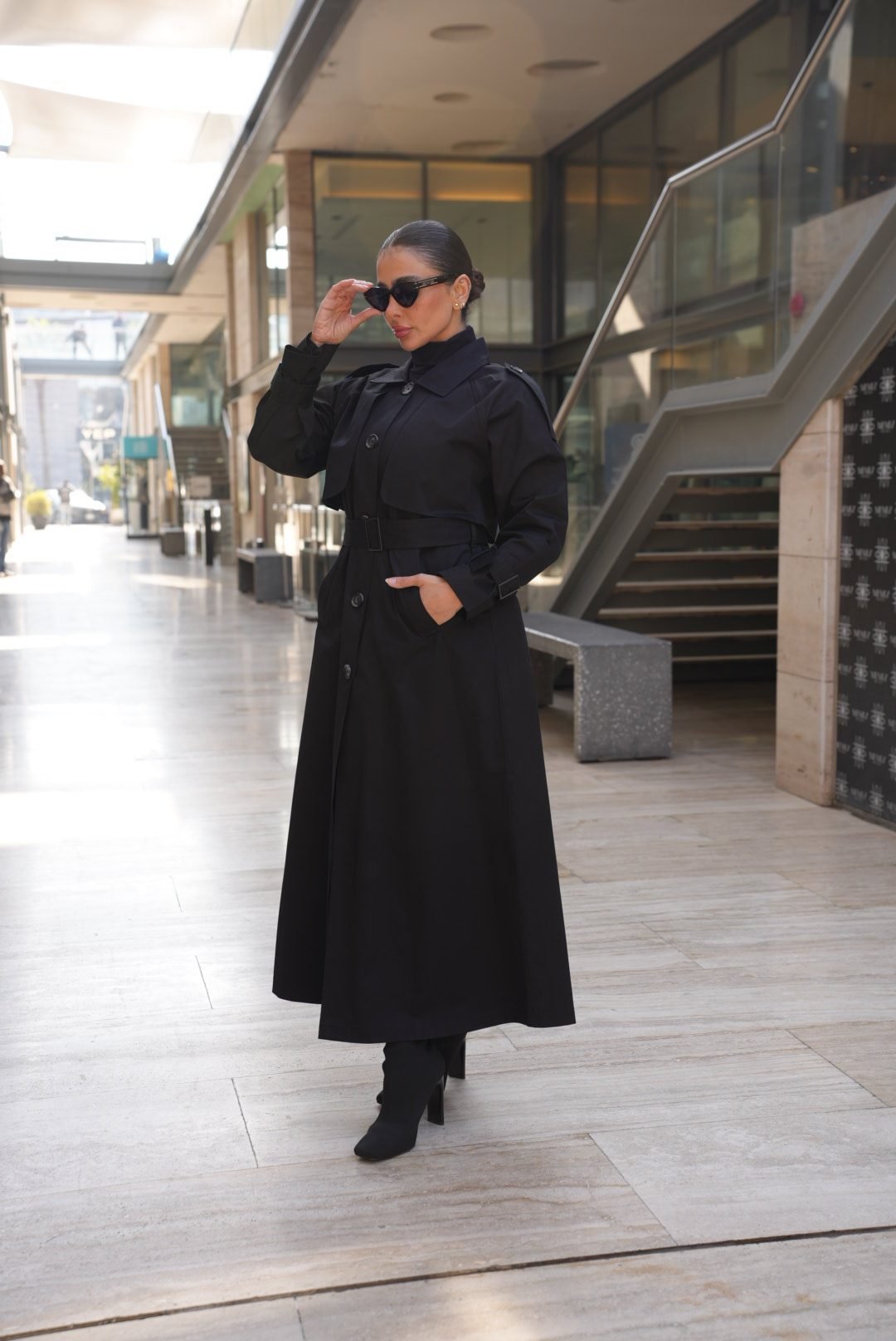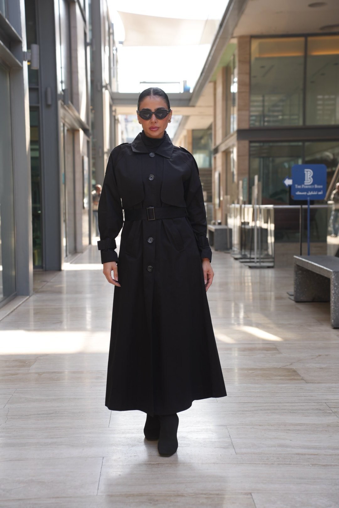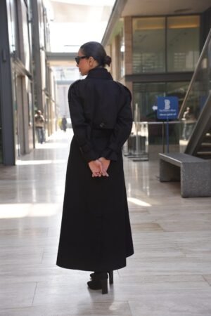 ترانشكوت أسود مصنوع من خامة مكس مارا الفاخرة، يتميز بتصميم كلاسيكي أنيق مع حزام على الخصر يضفي لمسة أنثوية راقية
