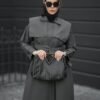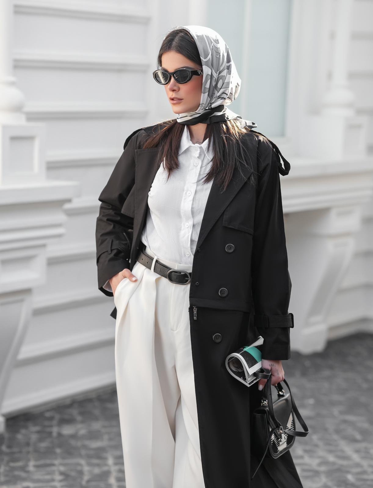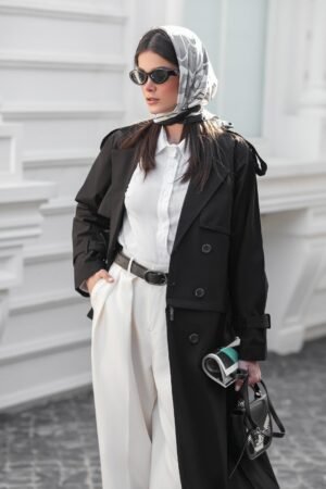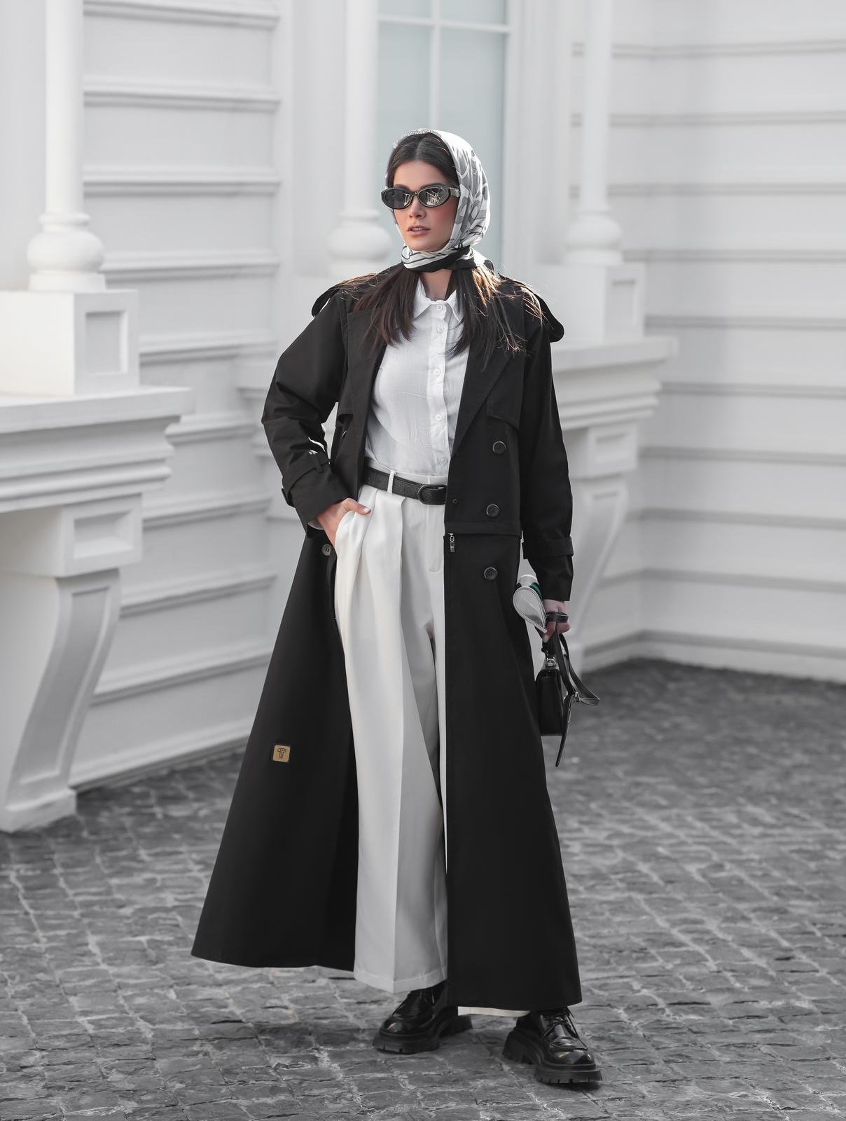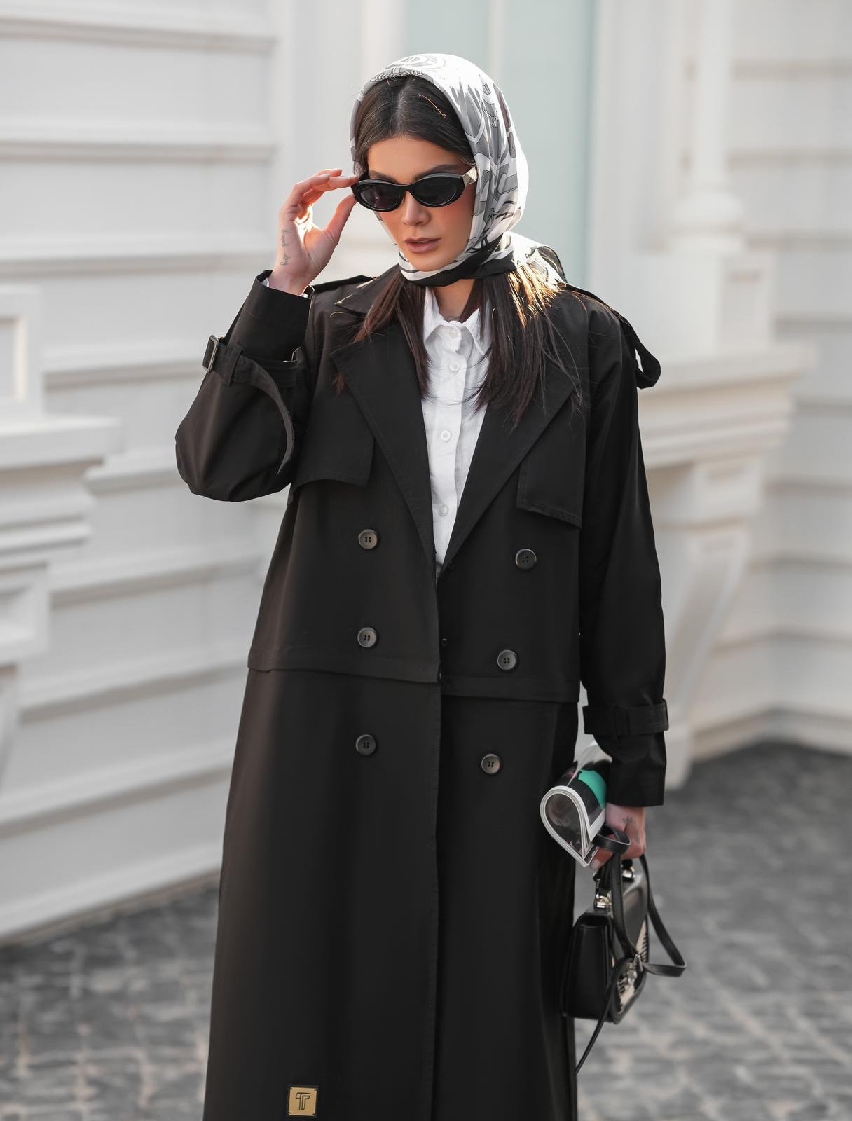 ترانشكوت أنيق بلون أسود مصنوع من خامة مكس مارا ، يتميز بسحاب في المنتصف يتيح لك تعديله بكل سهولة، يمكن فتحه لتحصلي على قصة قصيرة عصرية أو إبقاؤه مغلقاً لطول كامل كلاسيكي. تصميم عملي وراقي في نفس الوقت