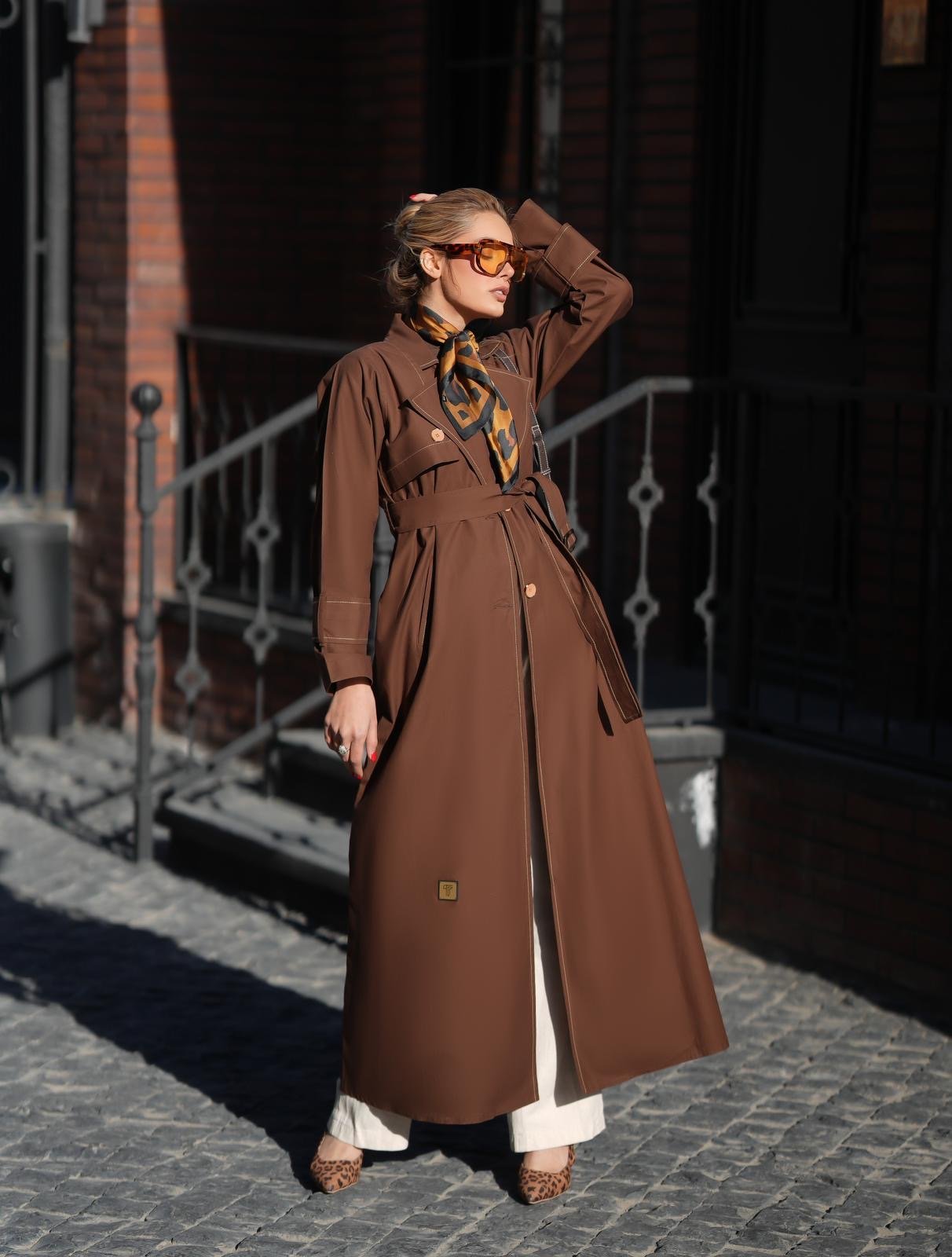 ترانشكوت بلون بني دافئ مصنوع من خامة مكس مارا الفاخرة، يتميز بقصّة كلاسيكية أنيقة مع حزام على الخصر يبرز القوام ويضيف لمسة أنثوية راقية. تصميمه يجمع بين العملية والفخامة، مما يجعله خيار مثالي للإطلالات اليومية والمناسبات.
