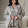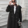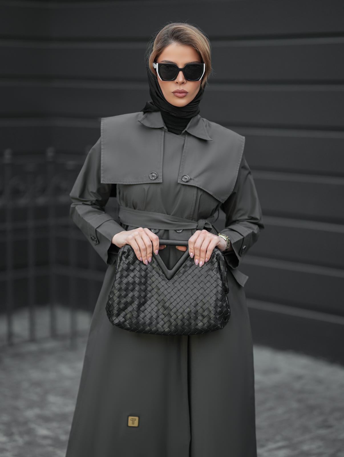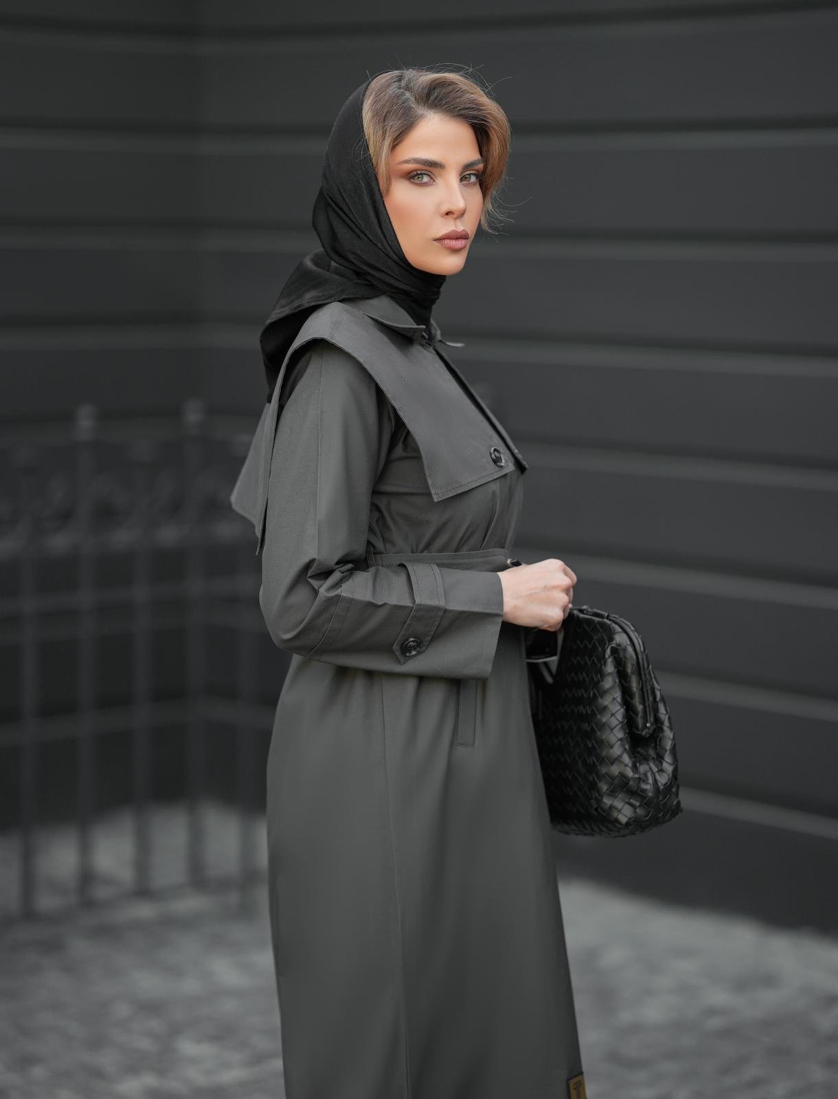 ترانشكوت أنيق مصنوع من خامة مكس مارت بلون رمادي غامق، بتصميم كلاسيكي راقٍ مزوّد بحزام يحدد الخصر ويضفي لمسة أنثوية أنيقة. يجمع بين البساطة والفخامة