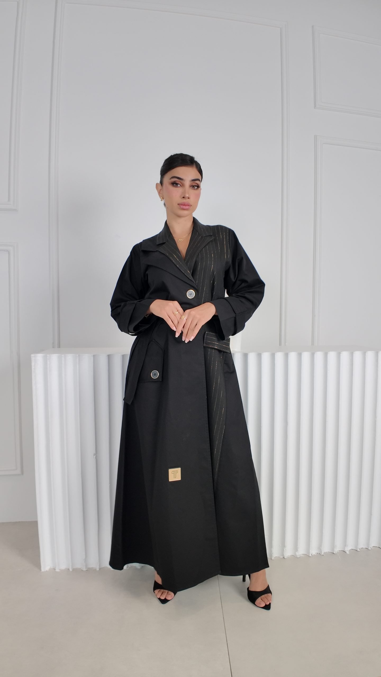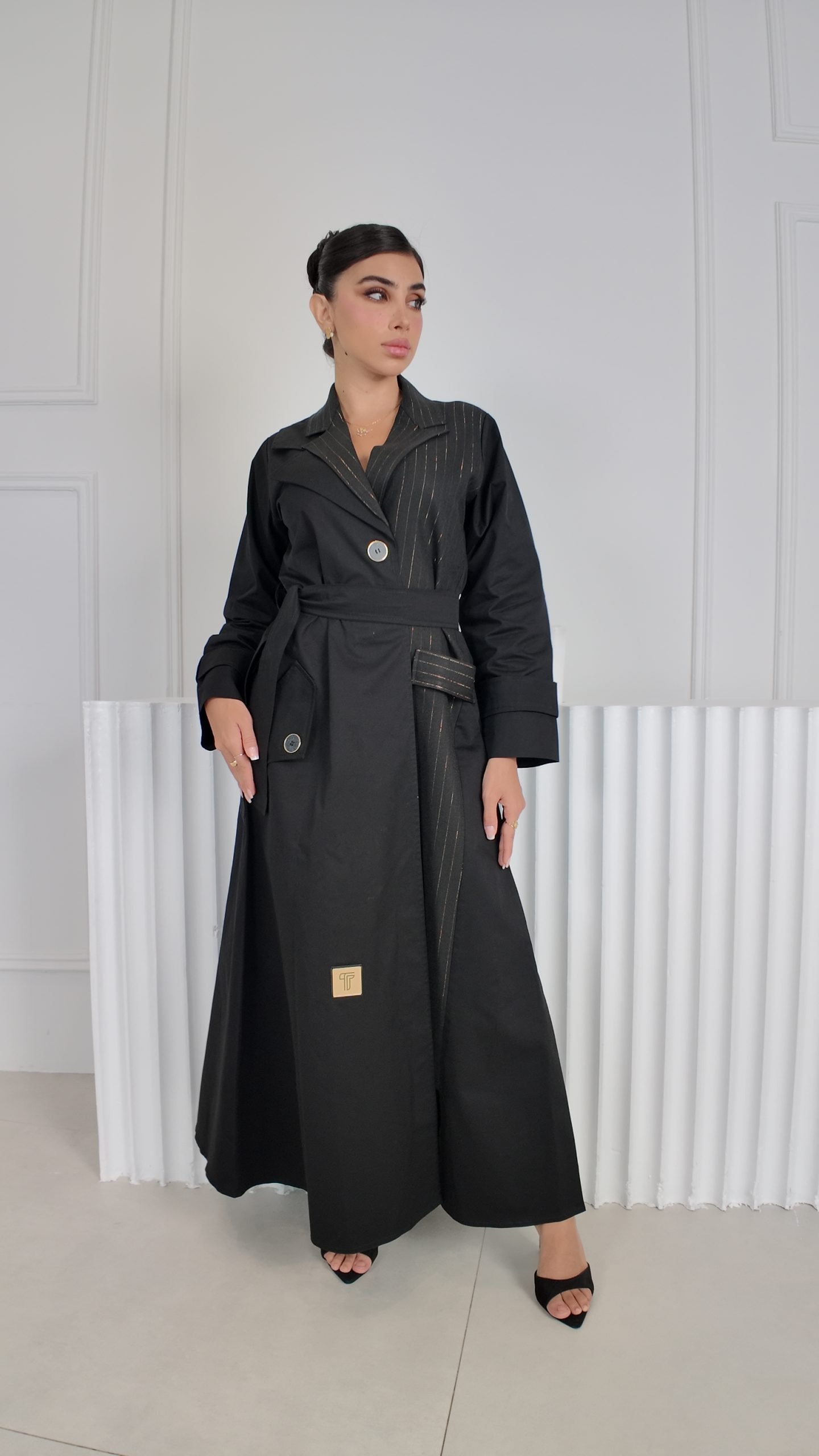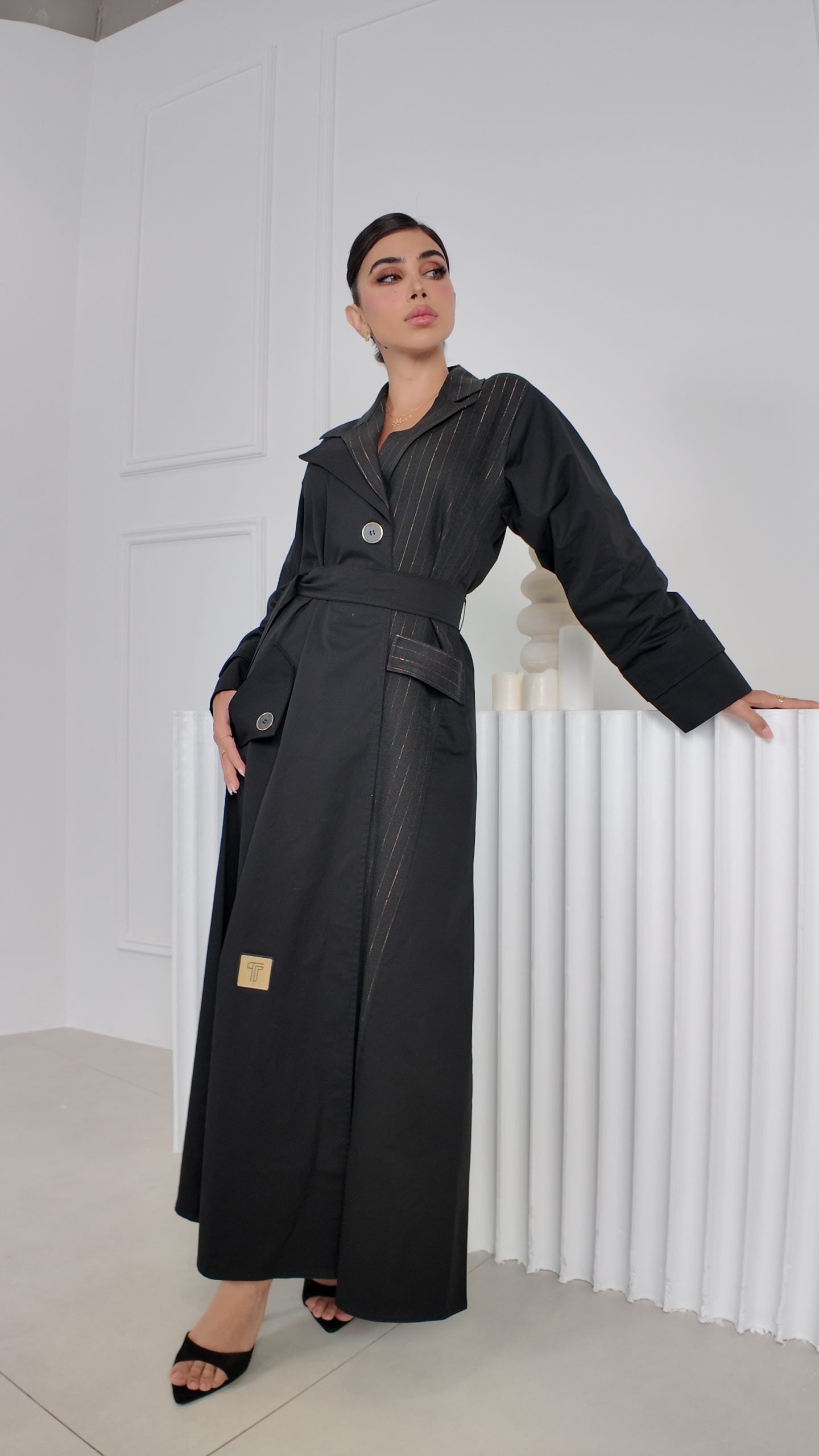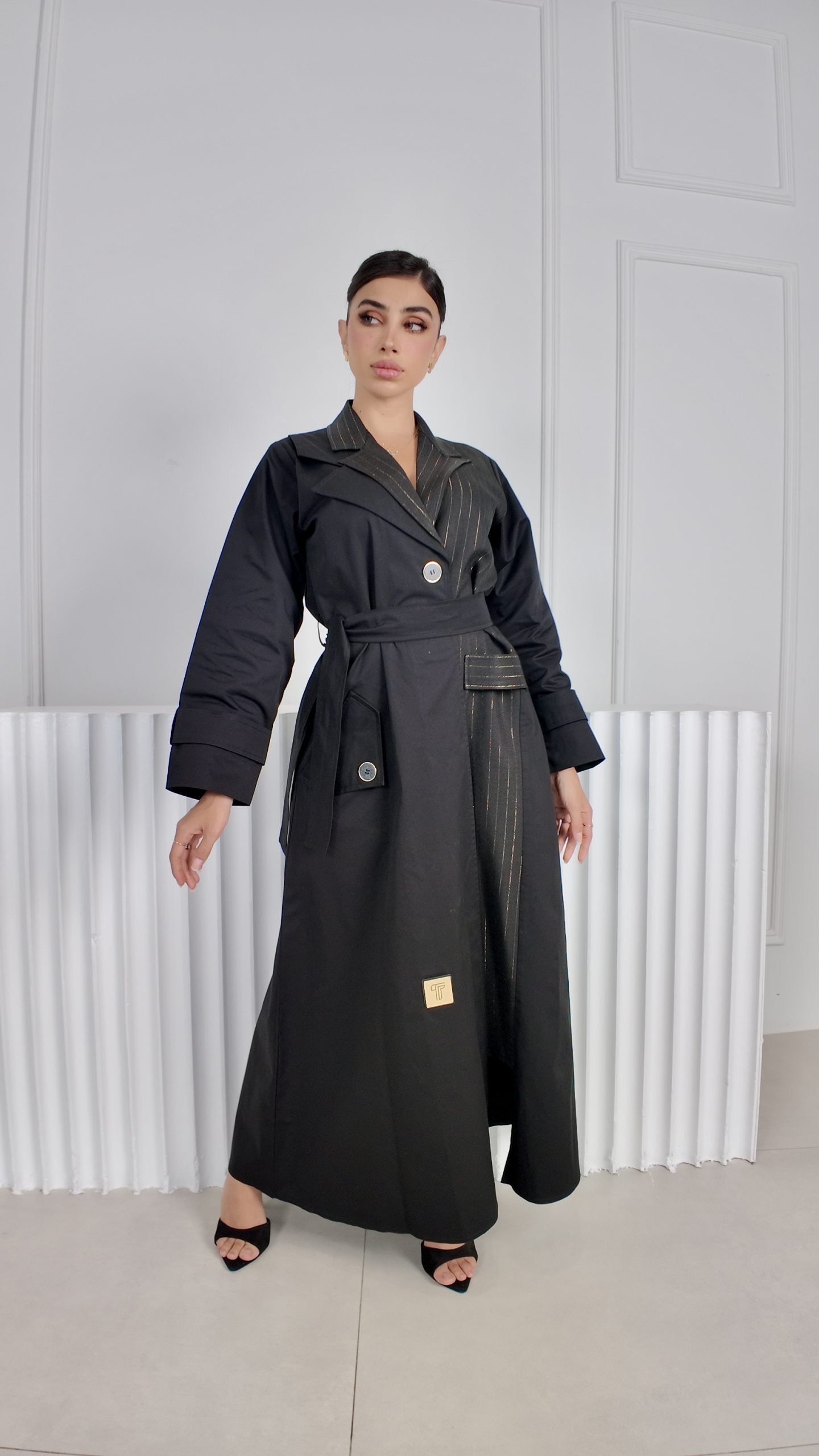 ترانشكوت أنيق مصنوع من خامة مكس مارا الفاخرة لون اسود، مزين بتفاصيل من كريب مقلم تضيف لمسة عصرية وحيوية للتصميم. يجمع بين الفخامة والعملية