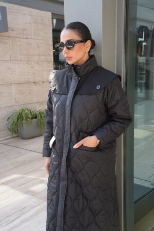 جاكيت شتوي أنيق من قماش الديباج الأسود، يتميز بتفاصيل راقية تشمل قطعة من “مكس مارا” على الكتف تضيف لمسة مميزة. مزوّد بسحاب عملي وجيوب تمنح التصميم طابعاً عملياً
