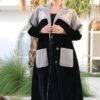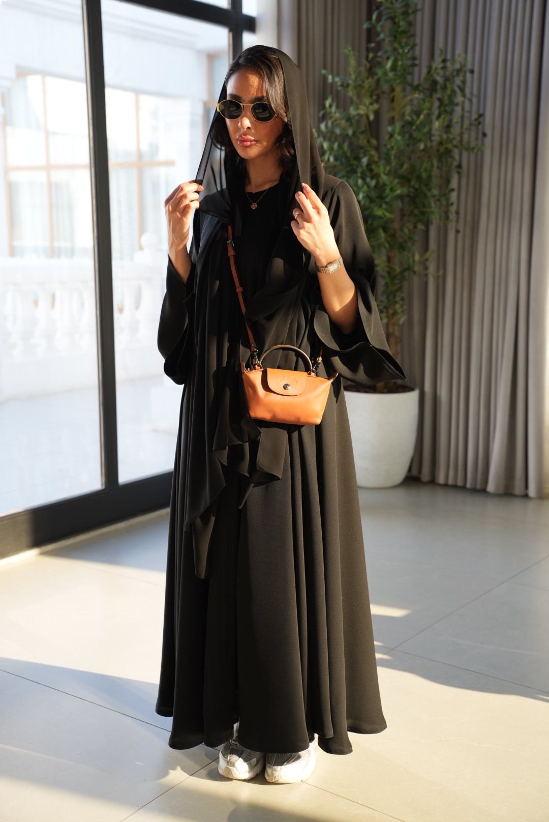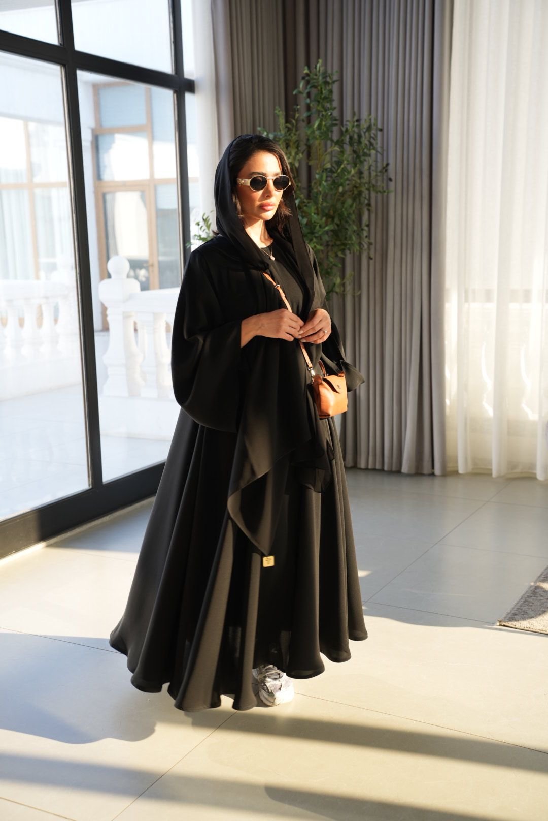 عباية أنيقة بلون أسود فاخر، مصنوعة من خامة إنترنت كوري أميرة بجودة عالية، بتصميم مسكّر بالكامل وقصة تربل كلوش تعطيها اتساع وانسيابية مميزة تضيف فخامة وحضور للإطلالة.