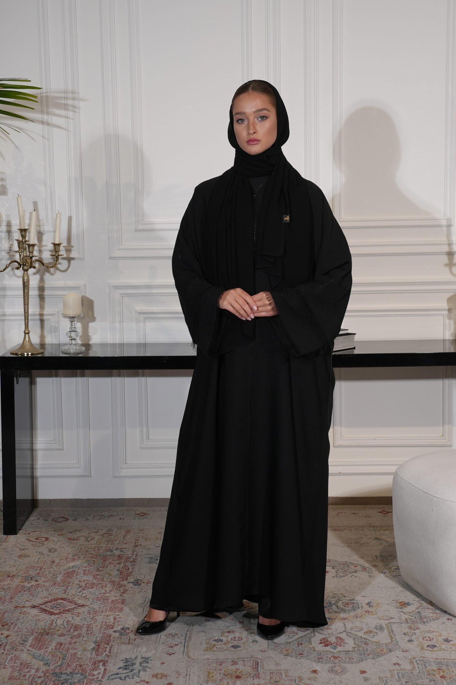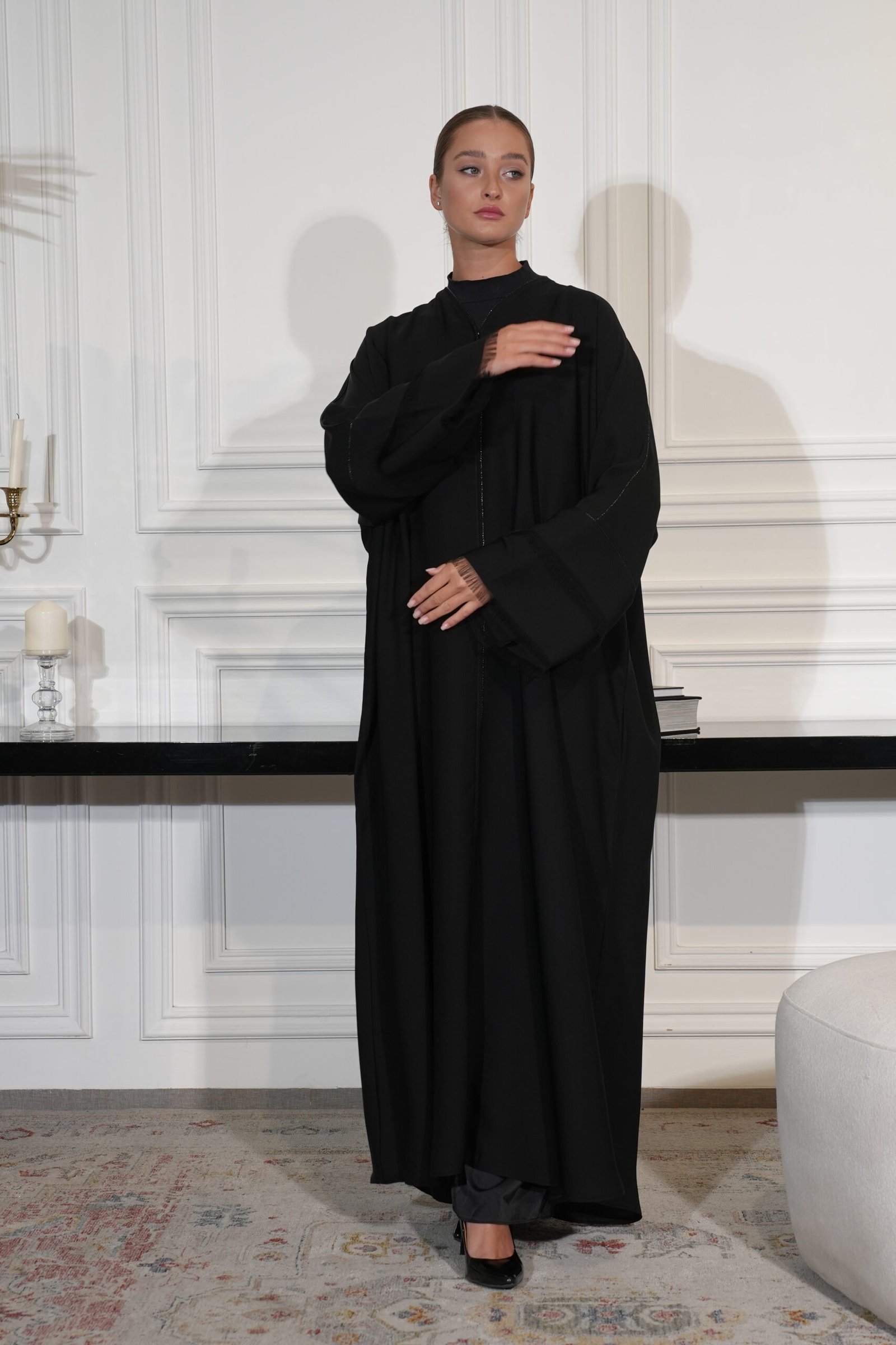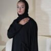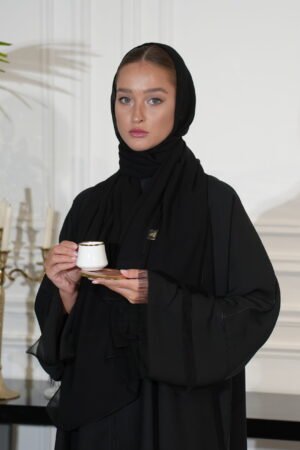 عباية إنترنت سوداء بتصميم قصة صينية مميزة، تجمع بين الأناقة والبساطة. تتميز بتفاصيل ناعمة على الأكمام مزينه بالهدب تضيف حركة ورقة للإطلالة، لتمنحك طابعاً عصرياً وأنيقاً في كل مناسبة.