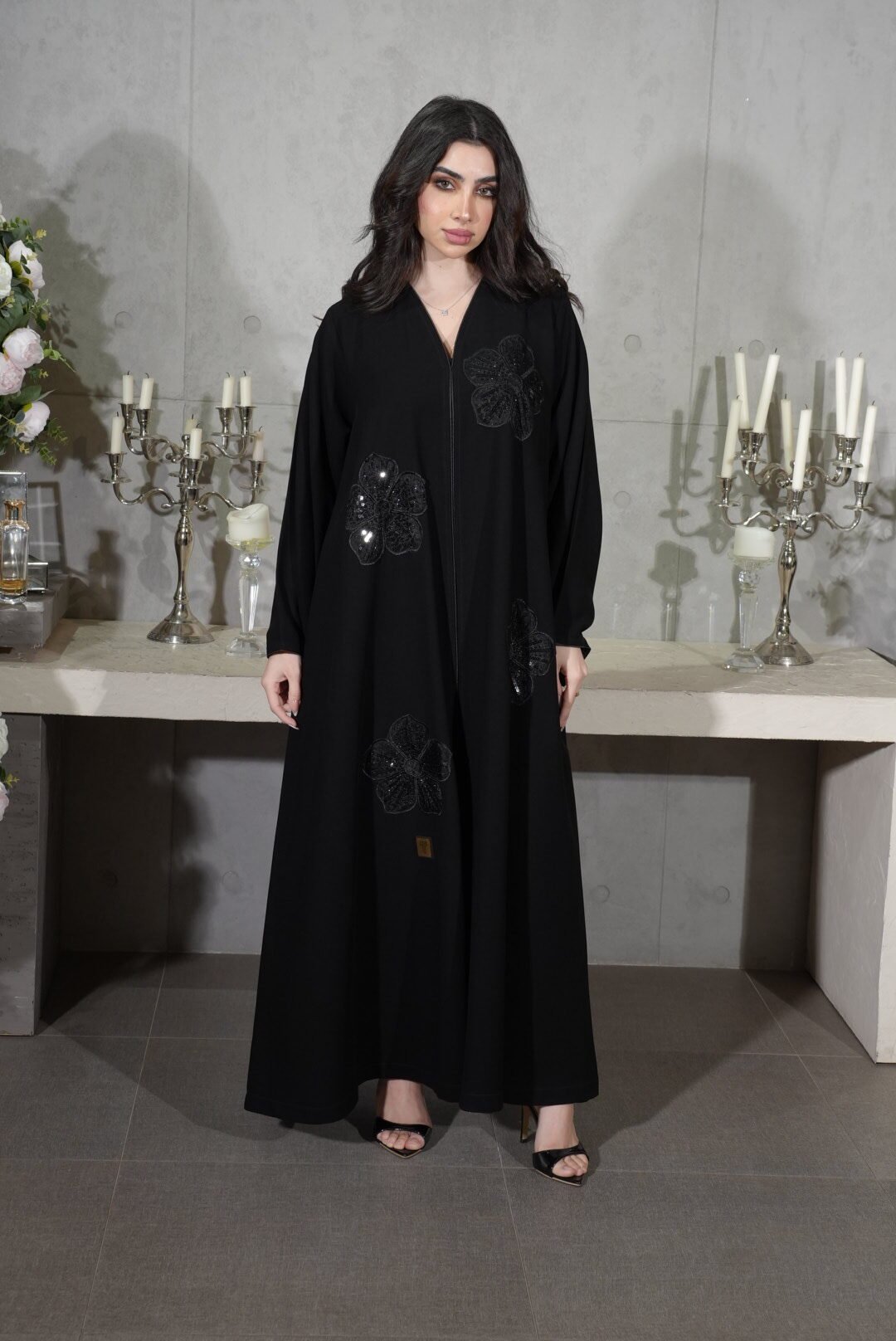 عباية سوداء أنيقة مصنوعة من خامة كوبا كوري الفاخرة، بتصميم مفتوح يليق بكل الأوقات. مزينة بتطريز فاخر مع شك ناعم على شكل ورد، يضيف لمسة فخامة وأنوثة على الإطلالة.