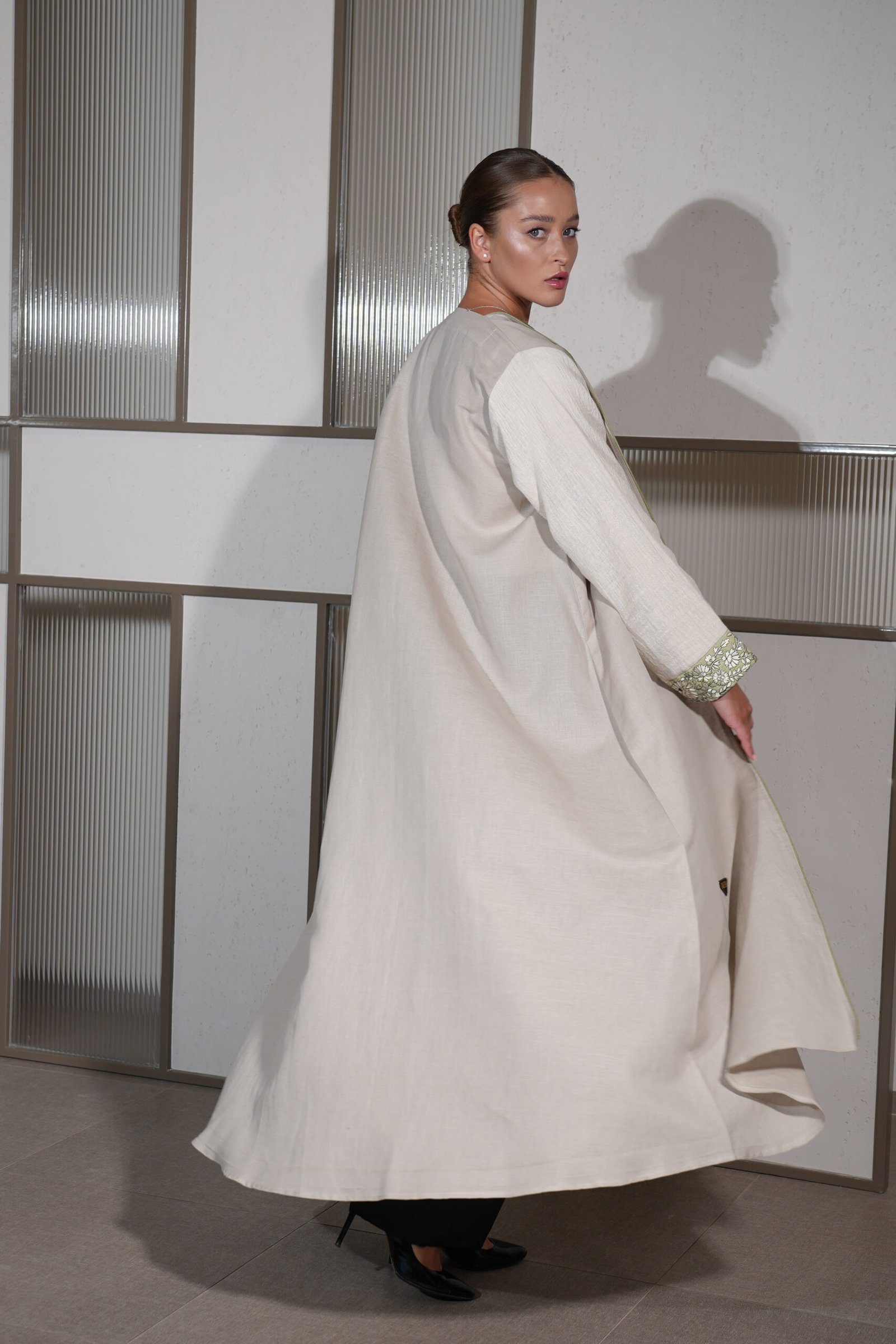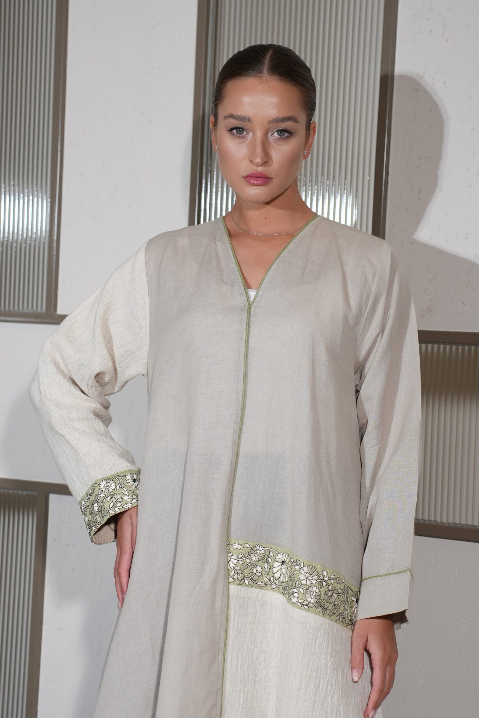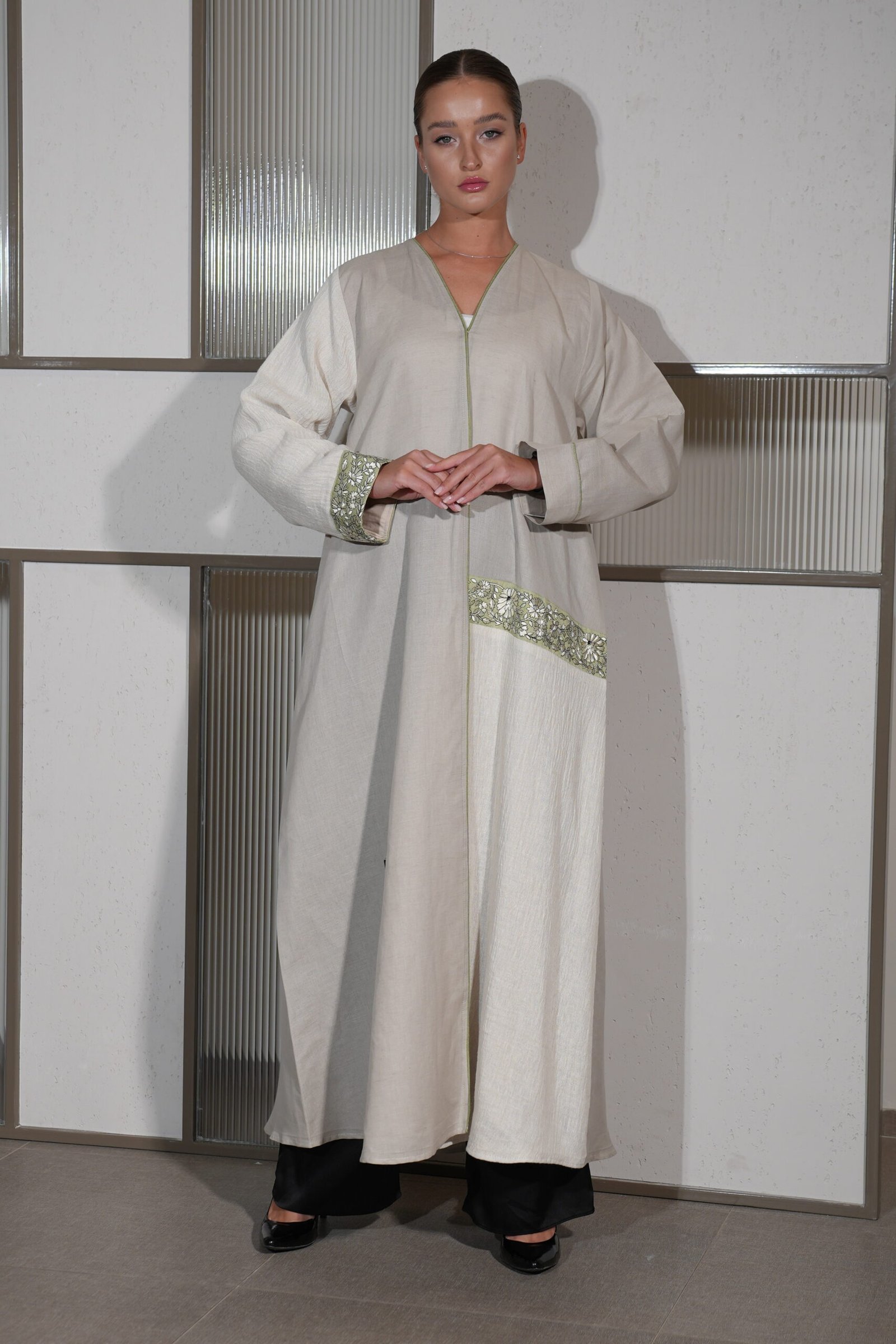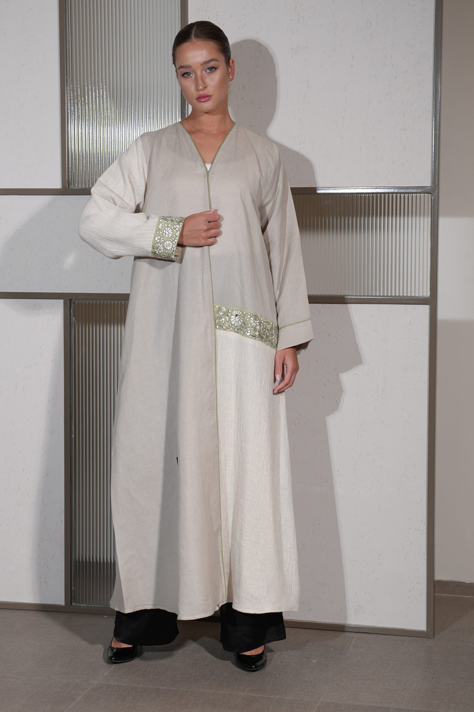 عباية مصممة من لينن طبيعي 100% بلون بيج، تداخل اللينن المعفّس يضفي لمسة عصرية ناعمة، مع تطريز باللون الأخضر الفاتح يزين التصميم بأسلوب راقٍ وهادئ. إطلالة مثالية لكل من تبحث عن البساطة بطابع أنثوي.